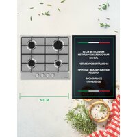 Панель оснащена итальянскими горелками Sabaf, которые отличаются высокой производительностью и надежностью. Это гарантирует вам быстрое приготовление блюд и одинаковую мощность на всех горелках. Функция контроля затухания пламени (FFD) обеспечит безопасность на кухне, автоматически отключая газ, если пламя по каким-либо причинам потухнет.