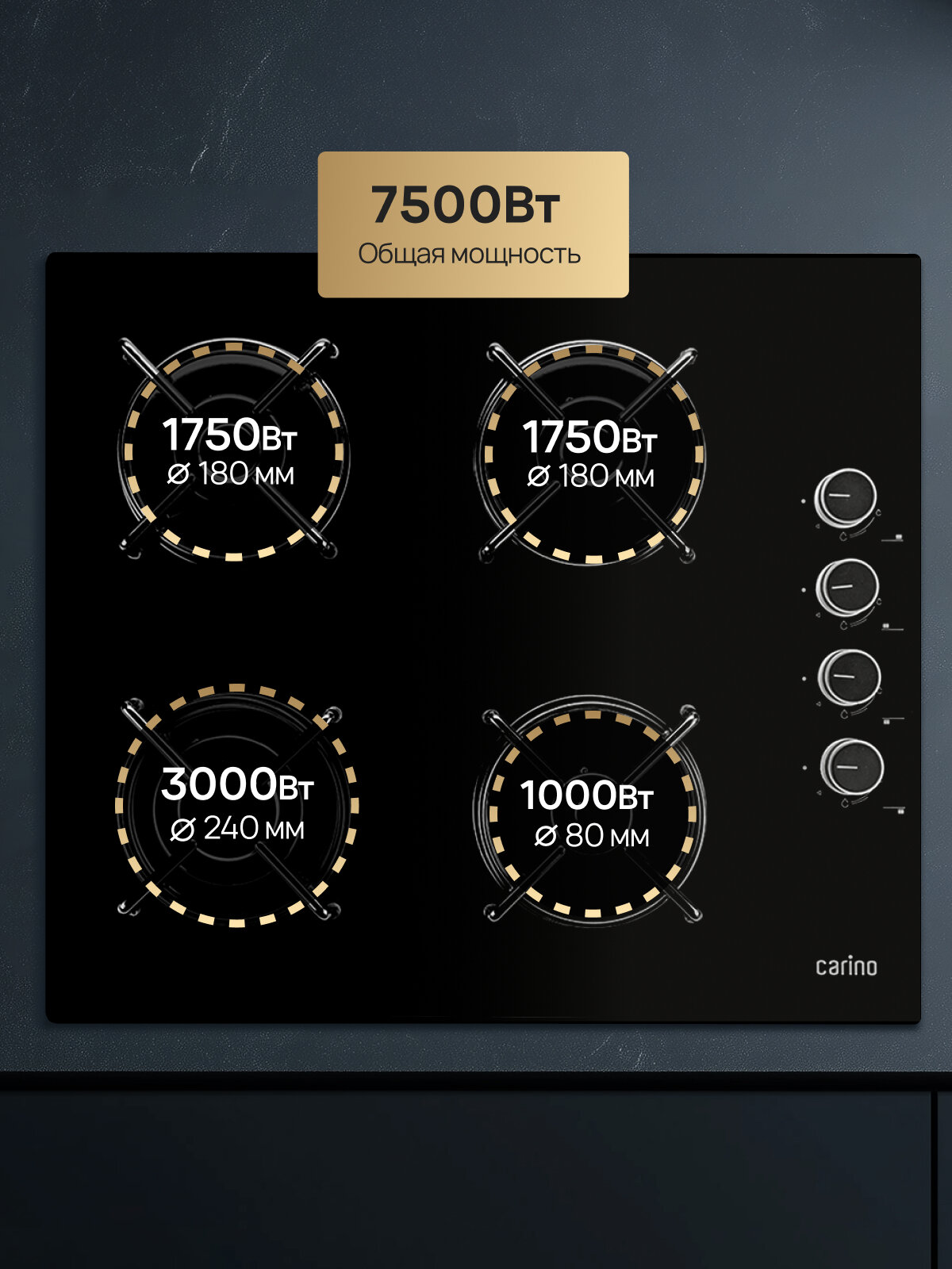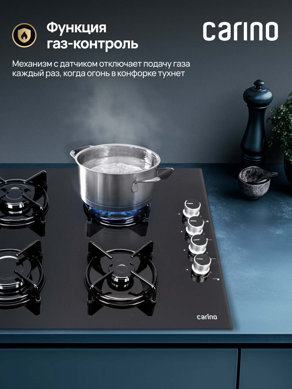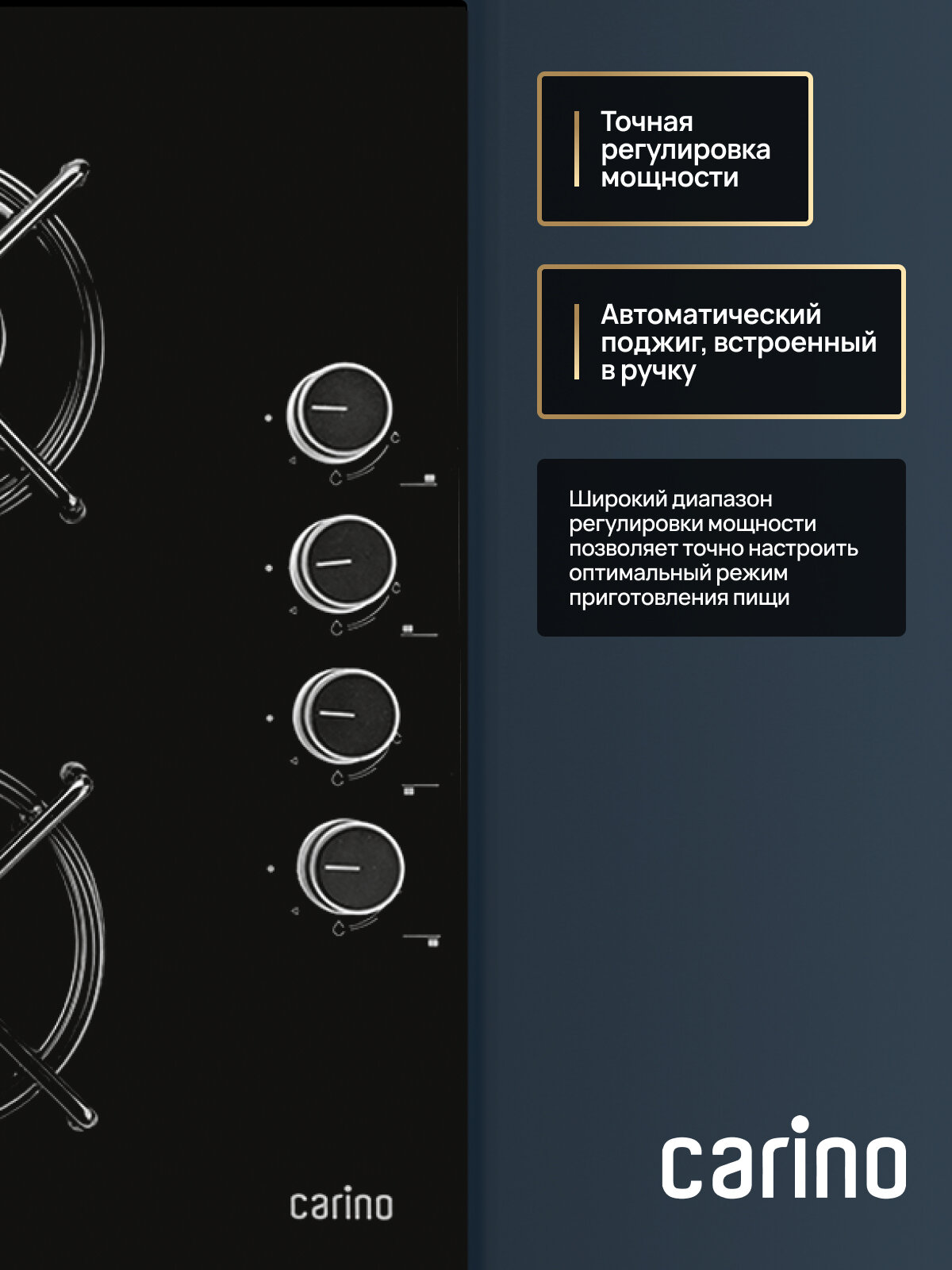 Газовая варочная панель CARINO CH60K40S111 60 см, газ-контроль, закаленное стекло, автоматический розжиг: сравнение цен, характеристики, фото, актуальное наличие и цены.