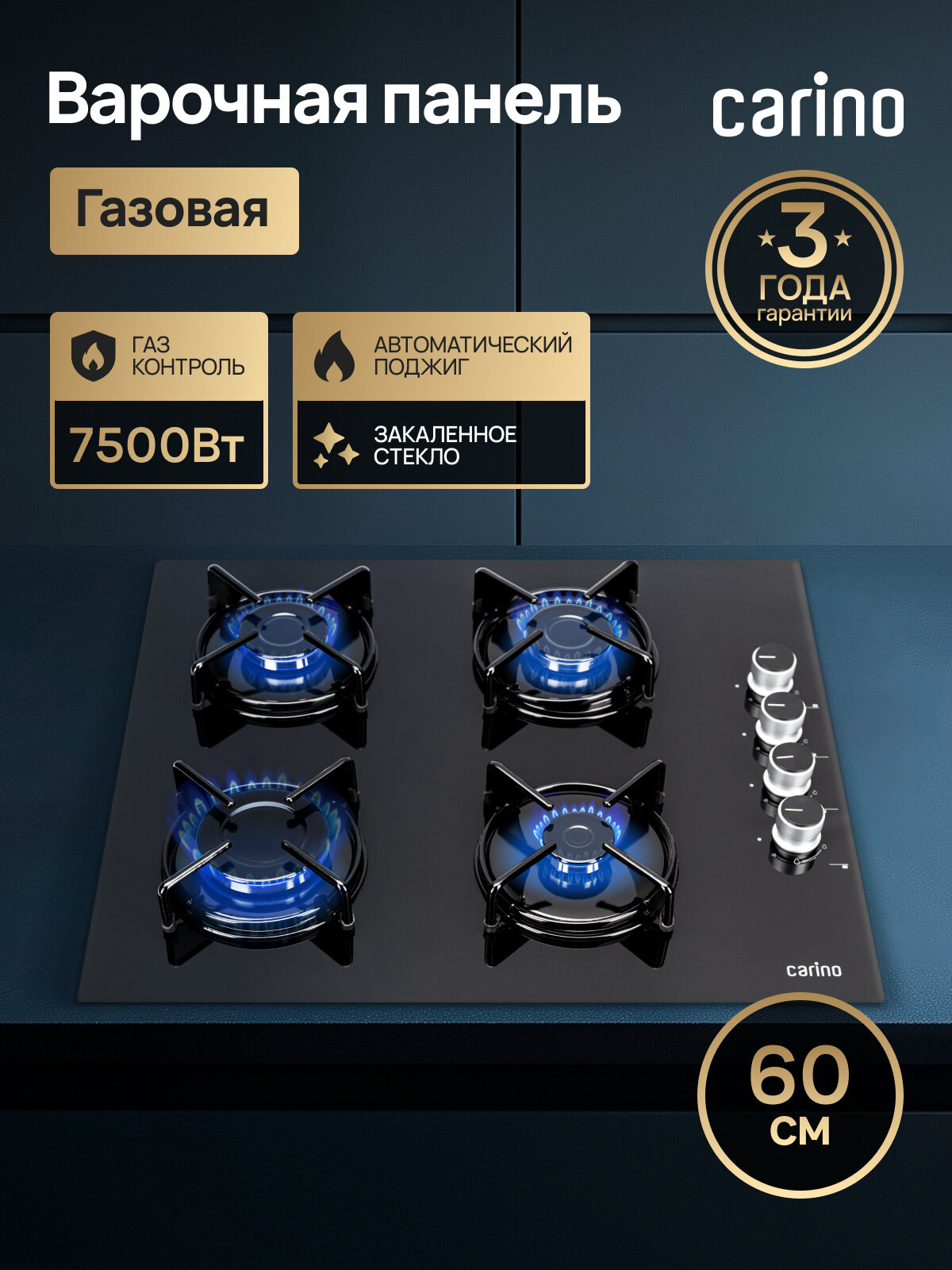Купить Газовая варочная панель CARINO CH60K40S111 60 см, газ-контроль, закаленное стекло, автоматический розжиг с доставкой по всей России.