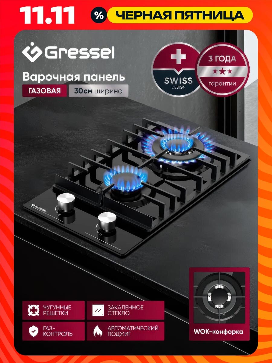 Купить Газовая варочная панель Gressel U30H20S001 30 см, закаленное стекло, WOK-конфорка, электроподжиг, газ-контроль с доставкой по всей России.