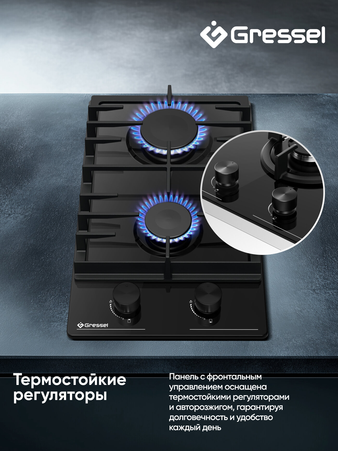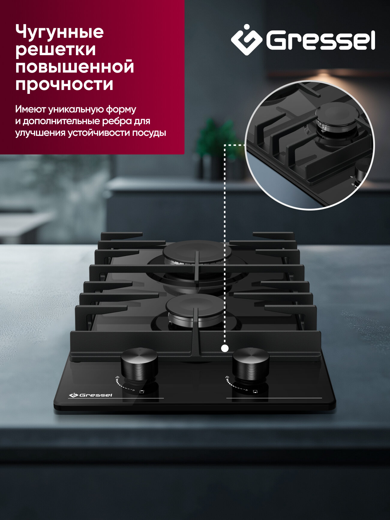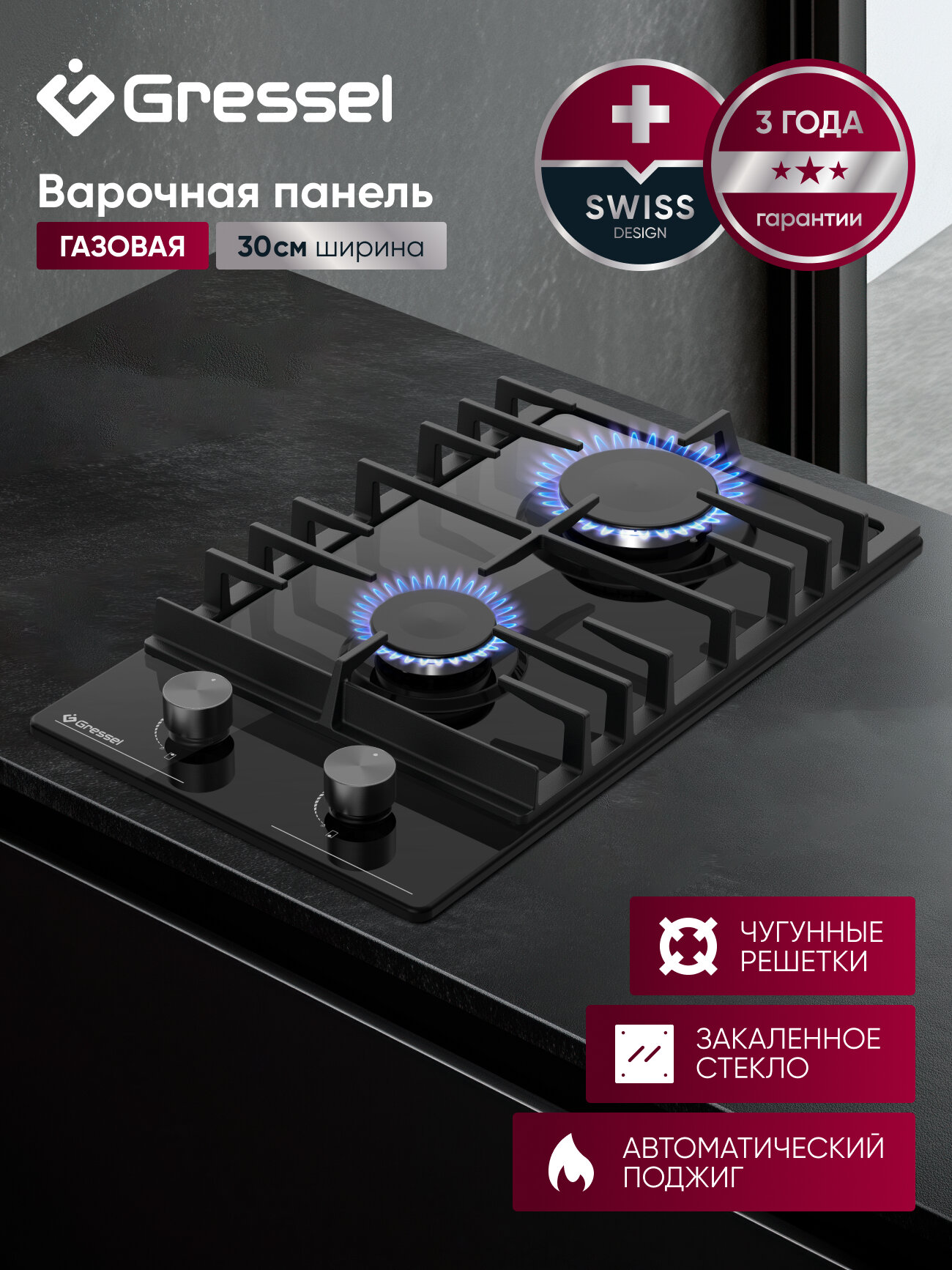 Купить Газовая варочная панель Gressel U30H20S088, стеклянная поверхность, чугунные решётки, 30 см, автоподжиг с доставкой по всей России.