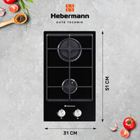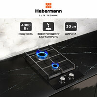 Купить Варочная панель газовая Hebermann HBGG 302.1 B, материал поверхности: закалённое стекло, материал решёток: чугун, термостойкие ручки Hitech, управление: Механическое, Электроподжиг, Газ-контроль с доставкой по всей России.