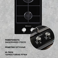 Варочная панель газовая Hebermann HBGG 302.1 B, материал поверхности: закалённое стекло, материал решёток: чугун, термостойкие ручки Hitech, управление: Механическое, Электроподжиг, Газ-контроль: сравнение цен, характеристики, фото, актуальное наличие и цены.