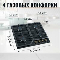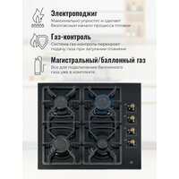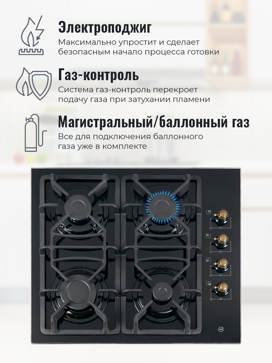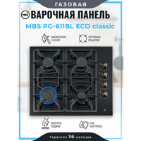 Газовая варочная панель MBS PG-611BL ECO classic/ширина 60см, 4 конфорки, закалённое стекло чёрного цвета, электроподжиг, WOK-конфорка, чугунные решётки, всё для подключения газового баллона: сравнение цен, характеристики, фото, актуальное наличие и цены.