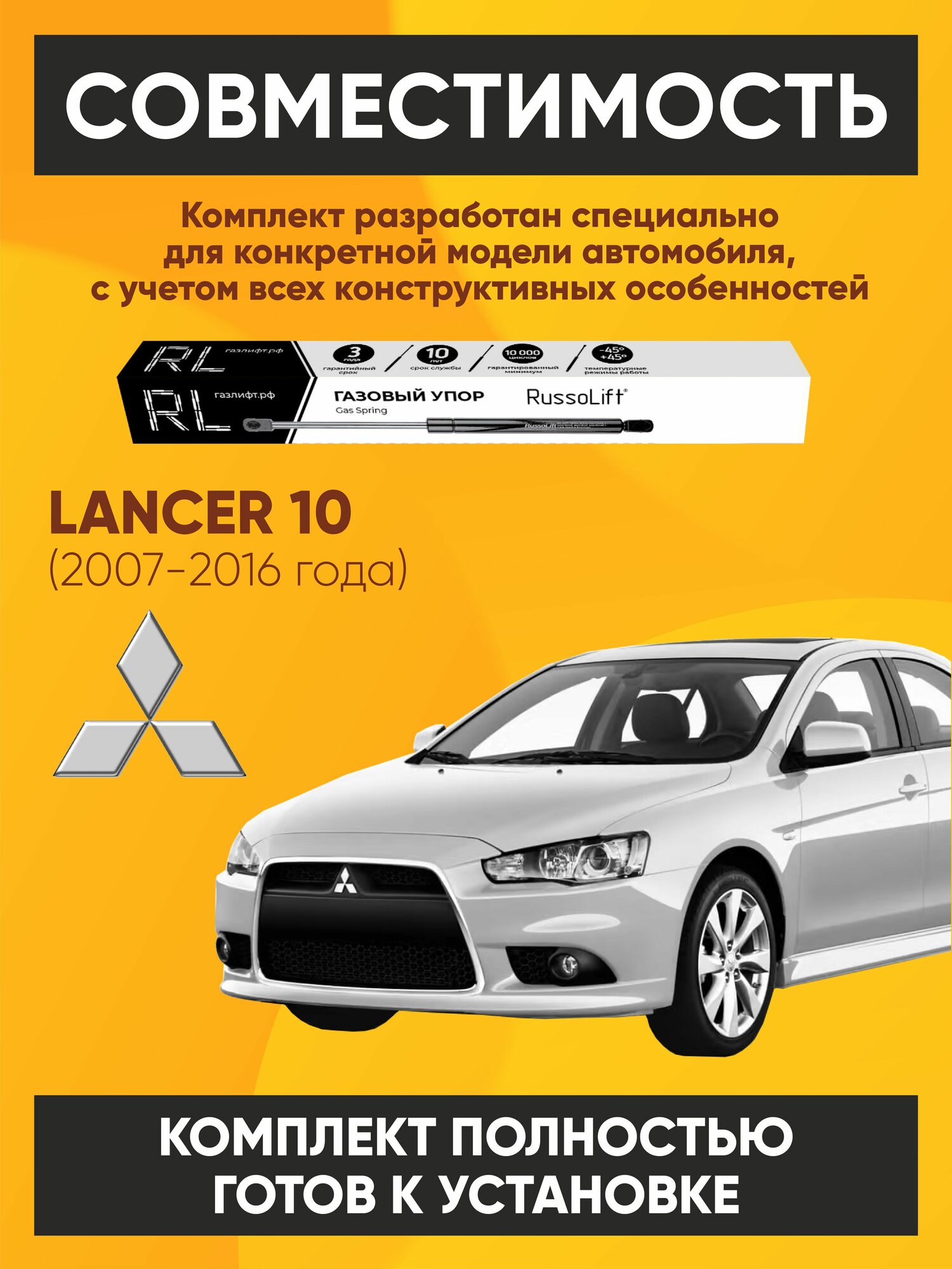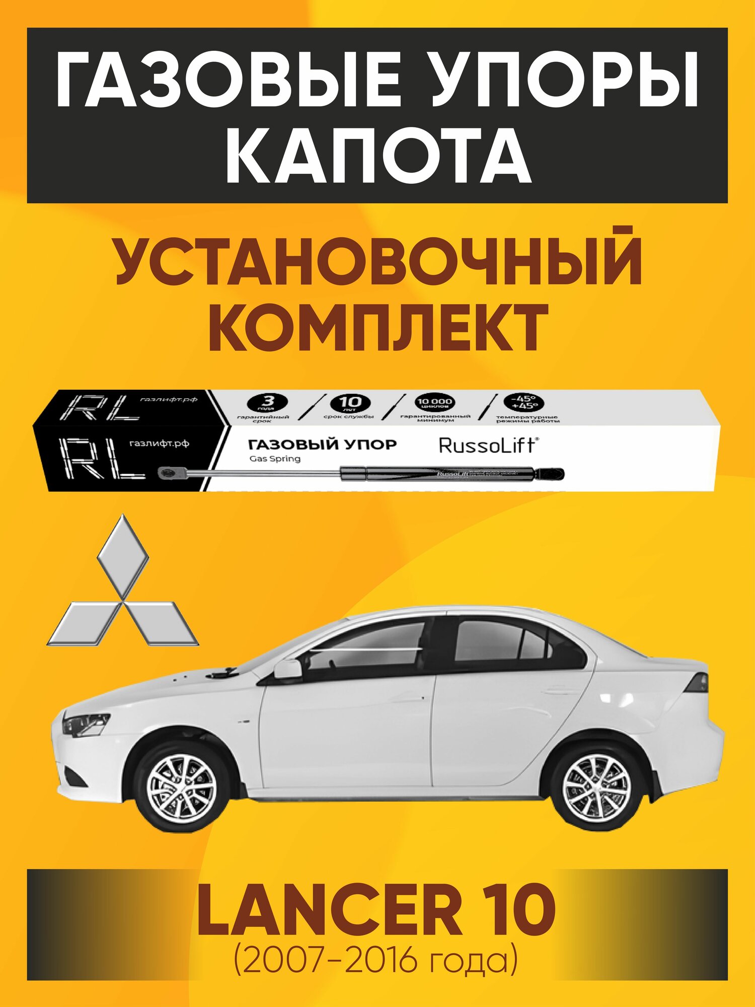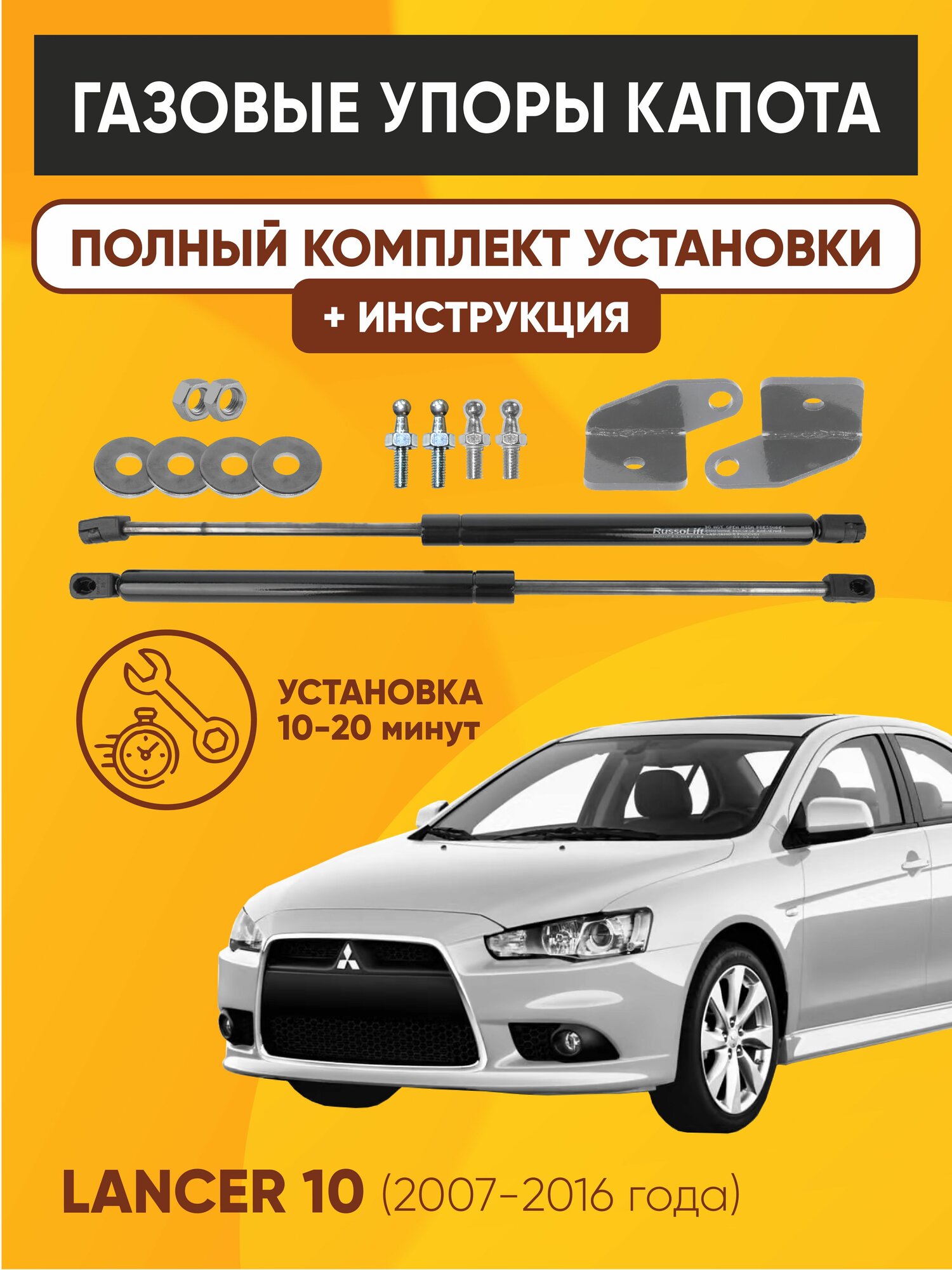 RUSSOLIFT представляет установочный комплект газовых упоров капота для автомобилей марки Mitsubishi "Лансер Х". Данный комплект совместим с автомобилем Mitsubishi Lancer 10 (2007-2016).