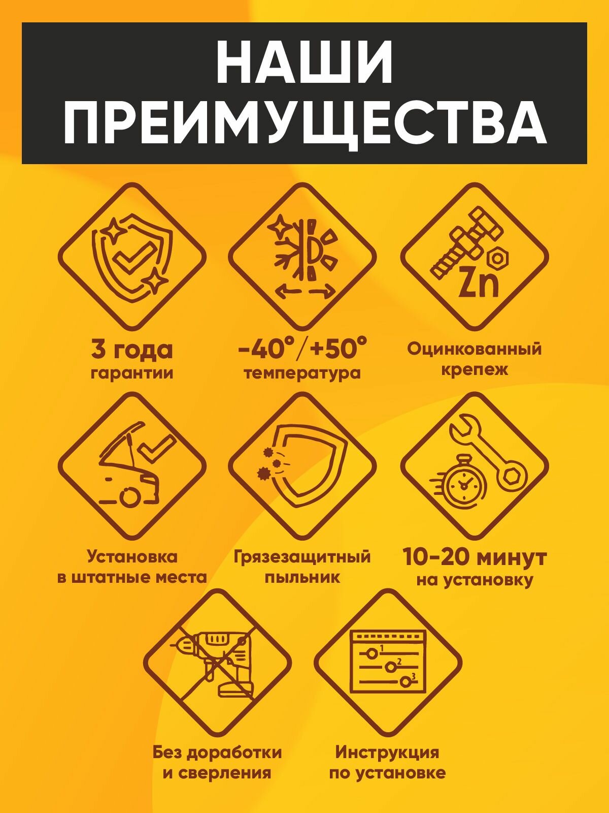 · Монтаж комплекта газовых упоров капота RUSSOLIFT не нуждается в конструктивных изменениях, не влияет на гарантию дилера, не требует дополнительных мер по техобслуживанию. Установка упоров выполняется за 15-20 минут, без использования клепок, без сверления дополнительных отверстий. Для установки амортизаторов не требуются специальные навыки и дополнительные детали.