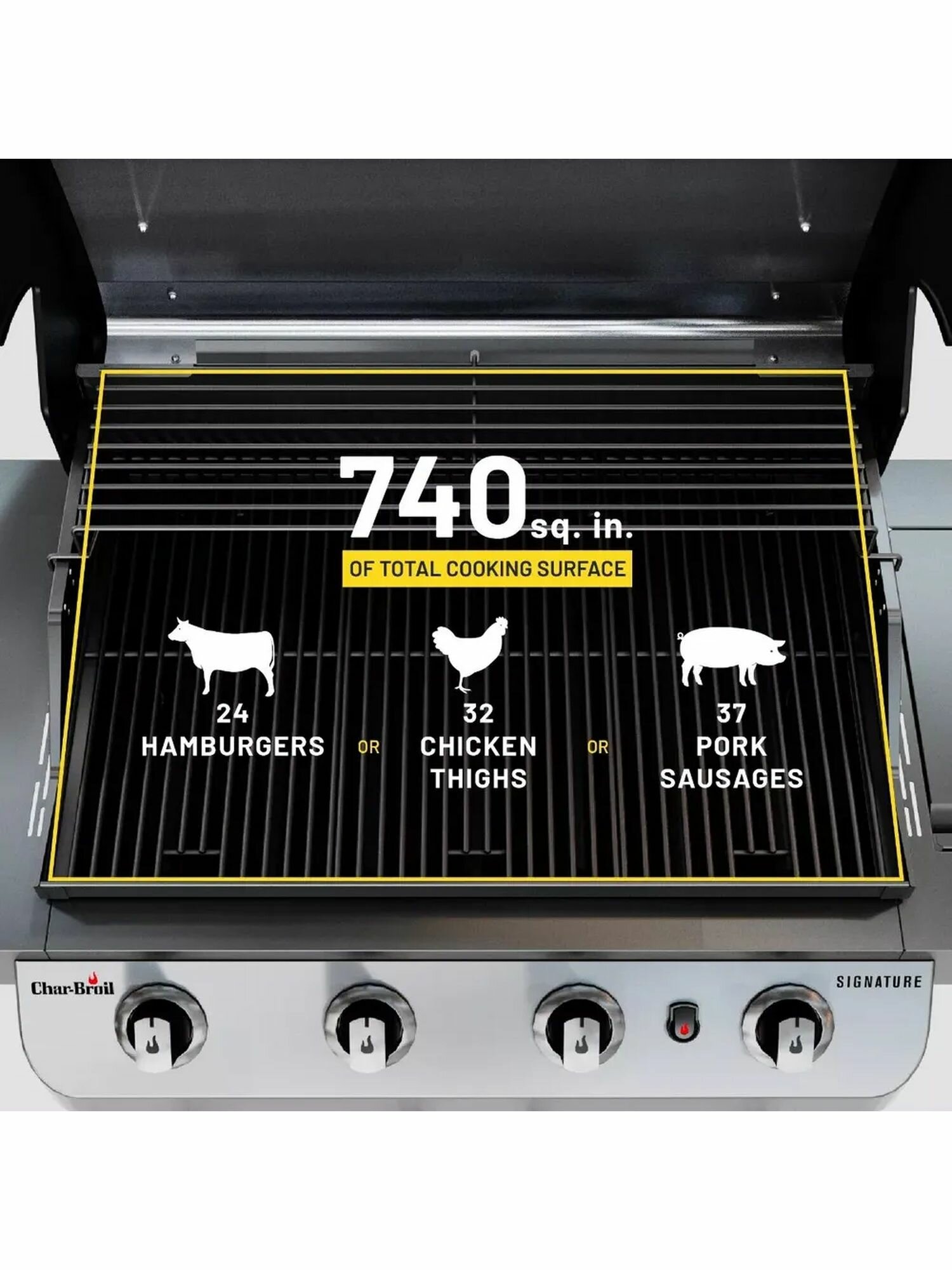Новинка сезона 2024, газовый гриль Char-Broil Signature Series 4S, это конвекционный гриль в его лучшем варианте. Котел с температурным зонированием (с помощью дополнительных треугольных пластин), корпус и рабочие решетки из нержавеющей стали, боковая горелка и электронный поджиг SureFire. Размеры в собранном виде: 140,5 x 70 x 117,5 см. Вес: 64 кг (В коробке: 78 кг).