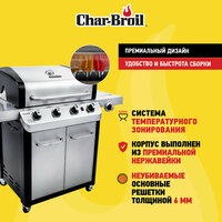 Новинка от Char-Broil - газовый конвекционный гриль с системой температурного зонирования. Имеет 4 основные горелки, боковую газовую горелку, решетки из нержавеющей стали. Оснащен съемным поддоном топки для более легкой очистки гриля после использования.
