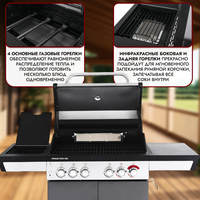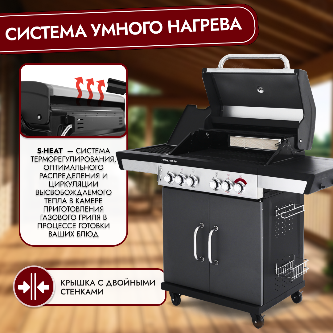 Газовый гриль PRIME PRO 510 от Start Grill создан для тех, кто любит готовить с комфортом. Гриль имеет четыре основные горелки, две дополнительные инфракрасные горелки и большую площадь жарочной поверхности. Это обеспечивает равномерное распределение основного тепла и быстрое нагревание инфракрасной горелки до 800°C для экспресс-обжарки мяса. В данном гриле реализована новейшая система распределения тепла при различных стилях и условиях приготовления – s-Heat! Это собственная уникальная разработка компании Start Grill! s-Heat (умный нагрев) — система терморегулирования, оптимального распределения и циркуляции высвобождаемого тепла в камере приготовления газового гриля в процессе готовки ваших блюд. В зависимости от выбранного режима приготовления, условий окружающей среды (атмосферное давление, ветер, низкие или высокие температуры окружающего воздуха) и стиля BBQ, данная система позволяет подобрать оптимальные режимы приготовления, чтобы ваше блюдо получилось бесподобным! Система s-Heat состоит из терморегулирующей пластины специальной формы и крепежа, что позволяет оперативно изменять конфигурацию гриля и настраивать режимы готовки индивидуально в каждом конкретном случае. Также дополнительные преимущества гриля - это подсветка ручек управления, контейнер для специй, корзина для аксессуаров и держатель полотенца. Эти элементы сделают готовку еще приятнее, а боковые столики удобны для приготовления и сервировки блюд. Крышка гриля выполнена из нержавеющей стали, которая отличается жаростойкостью и антибактериальными свойствами, поэтому чистка и уход за газовым грилем не доставит хлопот. Двойная конструкция крышки не нагревается снаружи и позволяет длительное время сохранять тепло внутри гриля. Решетка для приготовления данной модели выполнена из чугуна – материала, который сохраняет большое количество тепла, обладает долговечностью в эксплуатации, а также устойчив к ржавчине и высоким температурам. Также в комплекте решетка для подогрева из эмалированной стали. Использование газового гриля позволит не только сократить время для розжига гриля, но и сэкономить на топливе, ведь использование газа проще и экономичнее, по сравнению с углем и брикетами. Гриль разжигается с помощью пьезорозжига и питается от газовых баллонов. В комплекте предусмотрен шланг подачи газа и регулятор давления. А встроенный термометр поможет постоянно контролировать температуру и избежать резких перепадов, полностью контролировать процесс готовки и уберечь себя от испорченных блюд и настроения. Привлекательный дизайн, стальной материал корпуса, решетки и шесть горелок делают данный гриль универсальным и практичным. Готовьте с удовольствием! Перед сборкой гриля ознакомьтесь с инструкцией, которая входит в комплектацию модели, а также следуйте всем правилам эксплуатации.