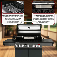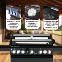 Газовый гриль PRIME PRO 610 – это большой газовый гриль премиального уровня, настоящая находка для любителей и ценителей приготовления барбекю на свежем воздухе. Объемная площадь жарочной поверхности дают простор для кулинарного творчества, обеспечивая бережное приготовление любимых блюд, сохраняя природные вкусовые и полезные качества еды. Расширенный функционал и высокие технические характеристики причисляют модель к эталонному уровню товаров BBQ отрасли. Одно из главных преимуществ модели PRIME PRO 610 – это равномерное распределение тепла, которое обеспечивают ряд основных 4-х трубчатых горелок и пятая инфракрасная горелка, расположенная с краю основной зоны приготовления. Инфракрасная горелка разогревается до 800°C и гарантирует идеальную экспресс-обжарку мяса. В данном гриле реализована новейшая система распределения тепла при различных стилях и условиях приготовления – s-Heat! Это собственная уникальная разработка компании Start Grill! s-Heat (умный нагрев) — система терморегулирования, оптимального распределения и циркуляции высвобождаемого тепла в камере приготовления газового гриля в процессе готовки ваших блюд. В зависимости от выбранного режима приготовления, условий окружающей среды (атмосферное давление, ветер, низкие или высокие температуры окружающего воздуха) и стиля BBQ, данная система позволяет подобрать оптимальные режимы приготовления, чтобы ваше блюдо получилось бесподобным! Система s-Heat состоит из терморегулирующей пластины специальной формы и крепежа, что позволяет оперативно изменять конфигурацию гриля и настраивать режимы готовки индивидуально в каждом конкретном случае. Гриль в базовом оснащении уже комплектуется электрическим вертелом. Дополнительная задняя инфракрасная горелка станет полезным атрибутом для быстрого запекания при использовании вертела. Дополнительная горелка, встроенная в боковой столик, также станет незаменимым помощником в приготовлении любимых блюд. Решетка боковой горелки изготовлена из чугуна. Управление горелками осуществляется с помощью ручек управления, расположенных на главной панели гриля. Ручки управления имеют яркую подсветку, а также индикацию режима работы, меняя свой цвет с синего на красный в положениях вкл. и выкл. В панель управления встроен проектор логотипа Start Grill, этот эффект придает атмосферности процессу приготовления. В крышке гриля установлено специальное жаропрочное стекло, позволяющее вести наблюдение за готовкой ваших блюд. На боковой стенки гриля предусмотрено два удобных аксессуара: это держатель полотенца и лоток для хранения специй и соусов, что неоспоримо скажется на комфорте и удобстве использования гриля. Также на боковом столике лаконично расположились крючки для размещения различных аксессуаров. Для сбора жира предусмотрено два поддона: основной и маленький дополнительный для быстрой очистки. Удобная ниша для хранения баллона позволяет вместить баллон до 18 л. Газовый гриль удачно впишется в летнюю веранду или открытую зону отдыха. Перед сборкой гриля ознакомьтесь с инструкцией, которая входит в комплектацию модели, а также следуйте всем правилам эксплуатации.