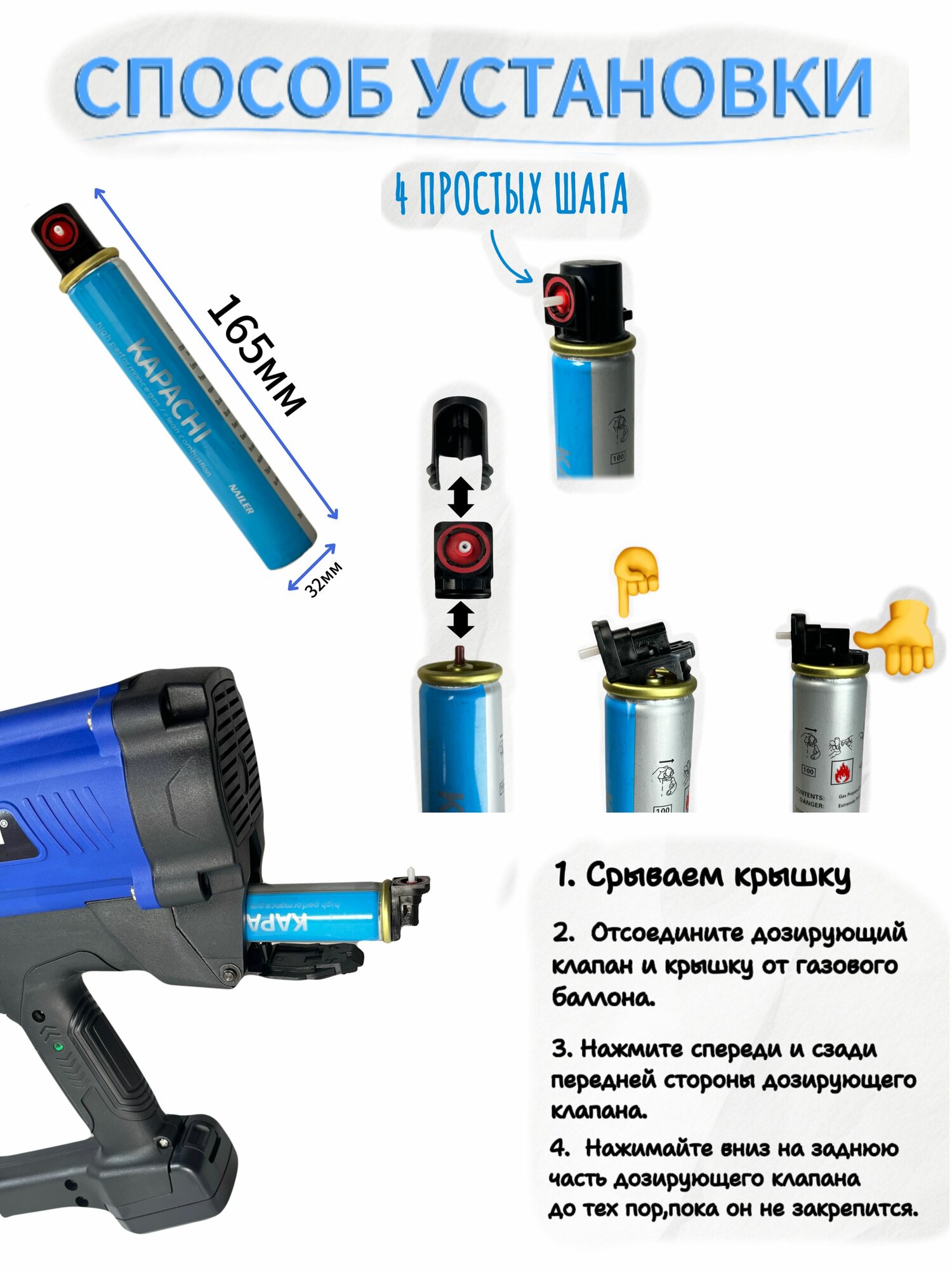 Гвоздезабивной газовый пистолет KAPACHI CAP-65 идеально подходит для забивания гвоздей в бетон, металл, кирпич, блоки от 16 до 40мм.