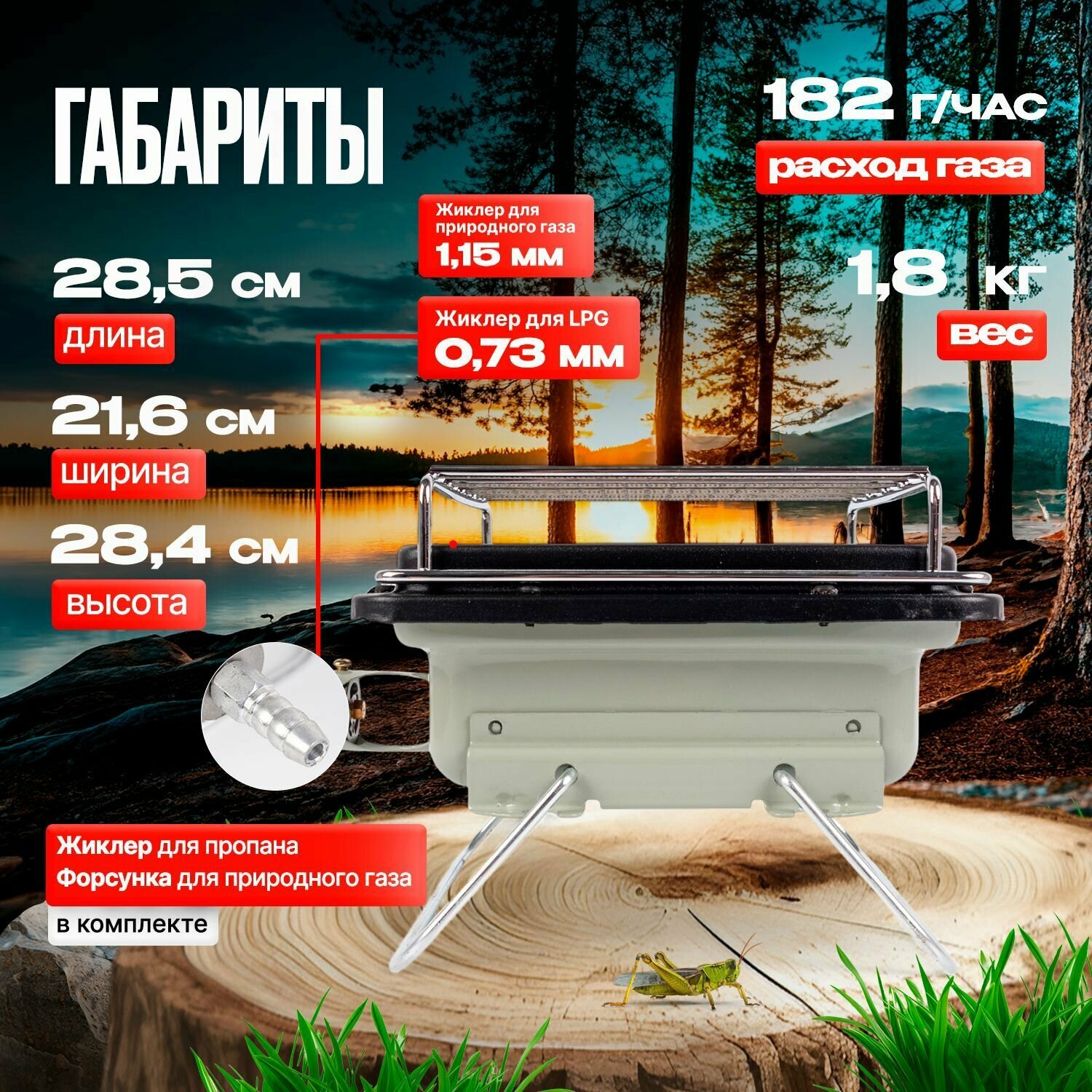 Обогреватель инфракрасный газовый ARMA AGH-2500 - 1шт Жиклер для газового баллона - 1шт Форсунка для природного газа - 1шт Подставка -1 шт Решетка для приготовления пищи Инструкция