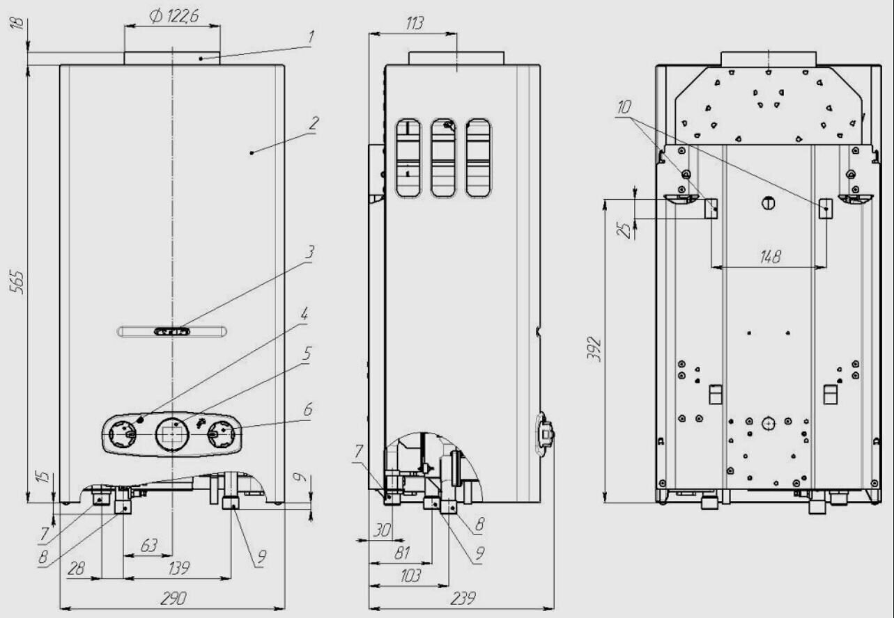 мин. давление воды: 0.15 атм; тип розжига: электроподжиг; диаметр дымохода: 120 мм; коэффициент полезного действия, %, не менее: 84; номинальное давление газа, кПа (мм вод. ст.): 1,3 (130), природного (G20, 2-е семейство, группа Н): 2,0 (200), сжиженного (G30, 3-е семейство, группа В/Р): 2,9 (300); номинальный расход природного газа, м3/ч: 2,22; номинальный расход сжиженного газа, кг/ч: 1,66; максимальное давление воды, кПа: 1000; минимальный расход воды, л/мин: 2,5