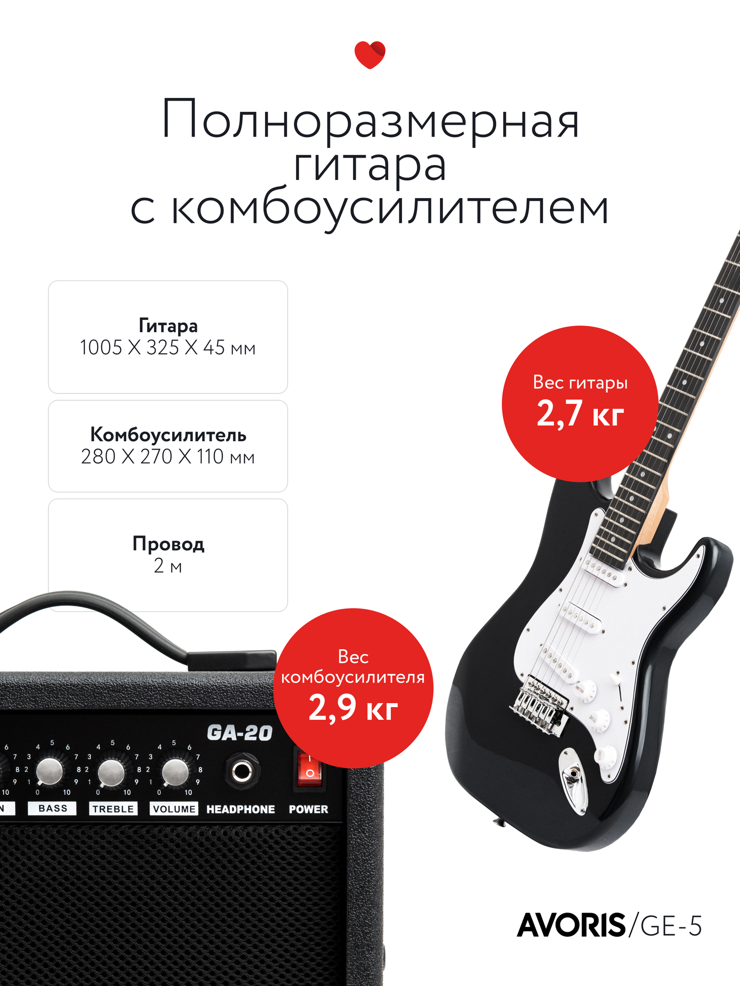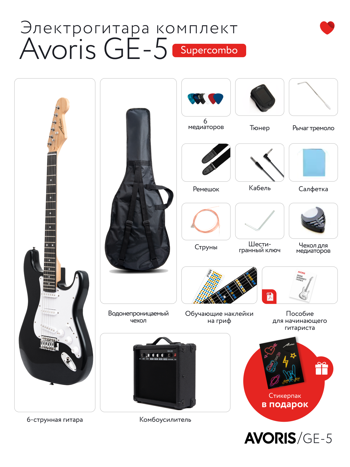 | Комплектация | гитарный усилитель, струны, чехол, кабель, медиатор, наклейка на гриф, пособие начинающего гитариста (цифровая версия), ремень, рычаг тремоло, салфетка, тюнер, чехол для медиаторов, шестигранный ключ |