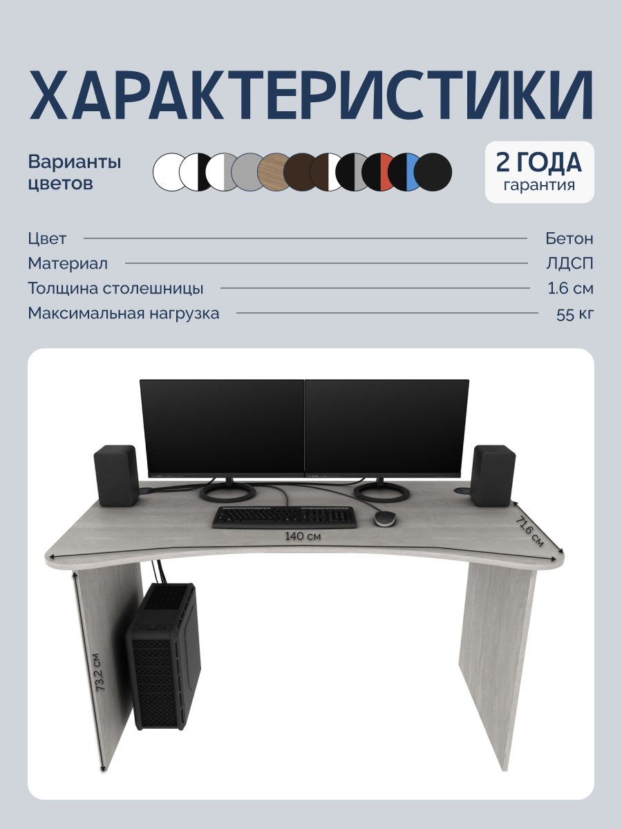 SURF 1400 Бетон - это не только функциональный, но и стильный геймерский компьютерный стол. Он подойдет как для домашнего использования, так и для офиса.