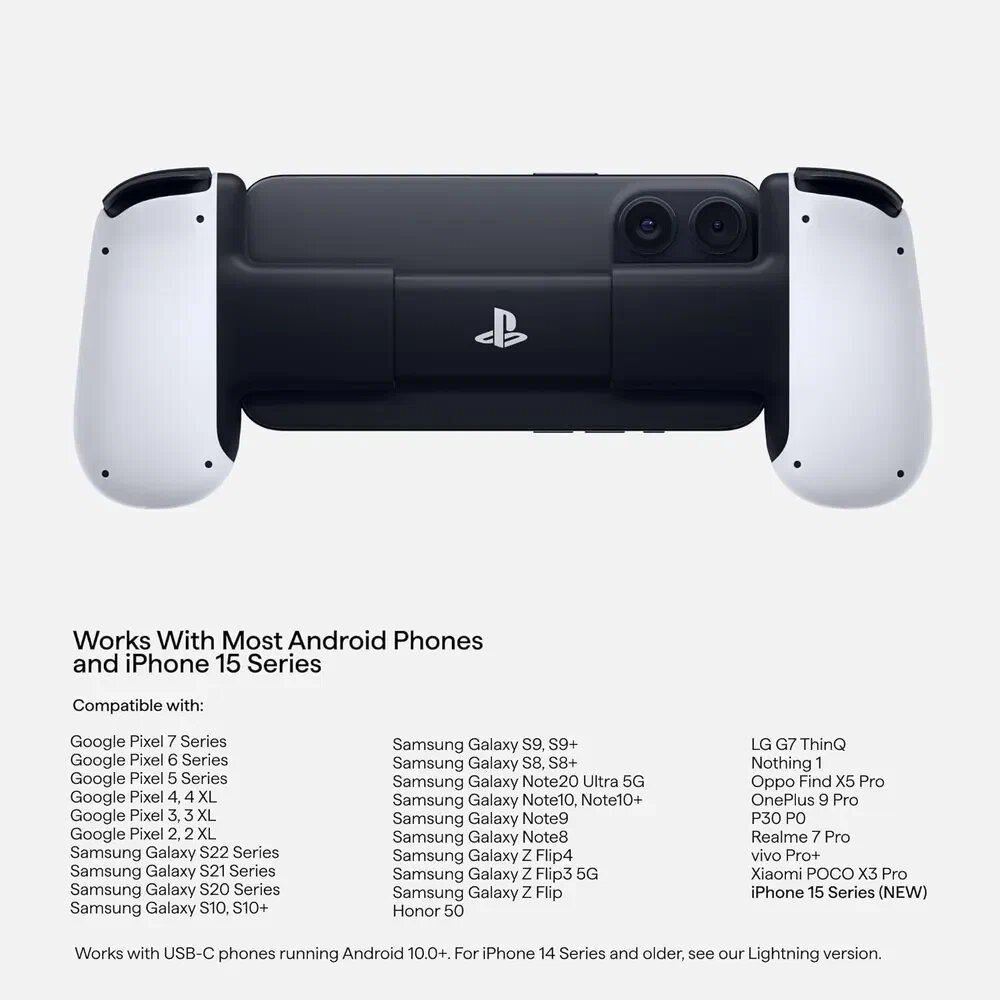 Backbone One Playstation Edition White для iPhone (Lightning) превращает ваш iPhone в идеальную игровую консоль. Подключите свой телефон и играйте в любую игру или сервис, включая Apple Arcade, игры App Store или даже транслируйте их прямо с Xbox или ПК². Совместим с большинством современных смартфонов Геймпад Backbone One 2-го поколения имеет в комплекте два набора магнитных адаптеров, которые обеспечат лучшее прилегание вашего смартфона с геймпадом. Backbone One спроектирован с учётом использования оригинальных чехлов Apple для iPhone. Выверенная эргономика и истинная портативность Backbone One разработан для получения максимального удовольствия от мобильного гейминга. Геймпад оснащен крупными чувствительными аналоговыми триггерами, двумя джойстиками, тактильной крестовиной и высокочувствительными кнопками на передней панели геймпада. Самая низкая задержка Наслаждайтесь сверхбыстрым игровым процессом с минимальном задержкой благодаря прямому подключению к разъёму Lightning вашего телефона. Заряжайте и играйте одновременно Играйте дольше благодаря сквозной зарядке, которая позволяет играть и заряжаться одновременно. Подключайте аудио-гарнитуру Геймпад Backbone One имеет разъём 3,5 мм miniJack с поддержкой микрофона, что позволит поддерживать общение с друзьями во внутриигровом чате. Backbone One превращает ваш iPhone в конечную консоль с помощью Lightning Connector. Вставьте телефон, играйте в любую игру или службу, поддерживающую контроллер, включая Apple Arcade, Xbox Game Pass Ultimate или даже потоковую передачу с Xbox, PlayStation или ПК. Совместимость: iPhone 14 iPhone 14 Plus iPhone 14 Pro Max iPhone 14 Pro iPhone 13 iPhone 13 mini iPhone 13 Pro Max iPhone 13 Pro iPhone 12 iPhone 12 mini iPhone 12 Pro Max iPhone 12 Pro iPhone 11 iPhone 11 Pro Max iPhone 11 Pro iPhone SE (1st Generation) iPhone SE (2nd Generation) iPhone SE (3rd Generation) iPhone XS iPhone XS Max iPhone XR iPhone X iPhone 8 iPhone 8 Plus iPhone 7 iPhone 7 Plus iPhone 6s iPhone 6s Plus