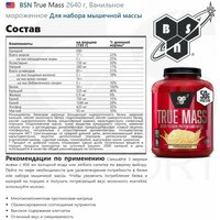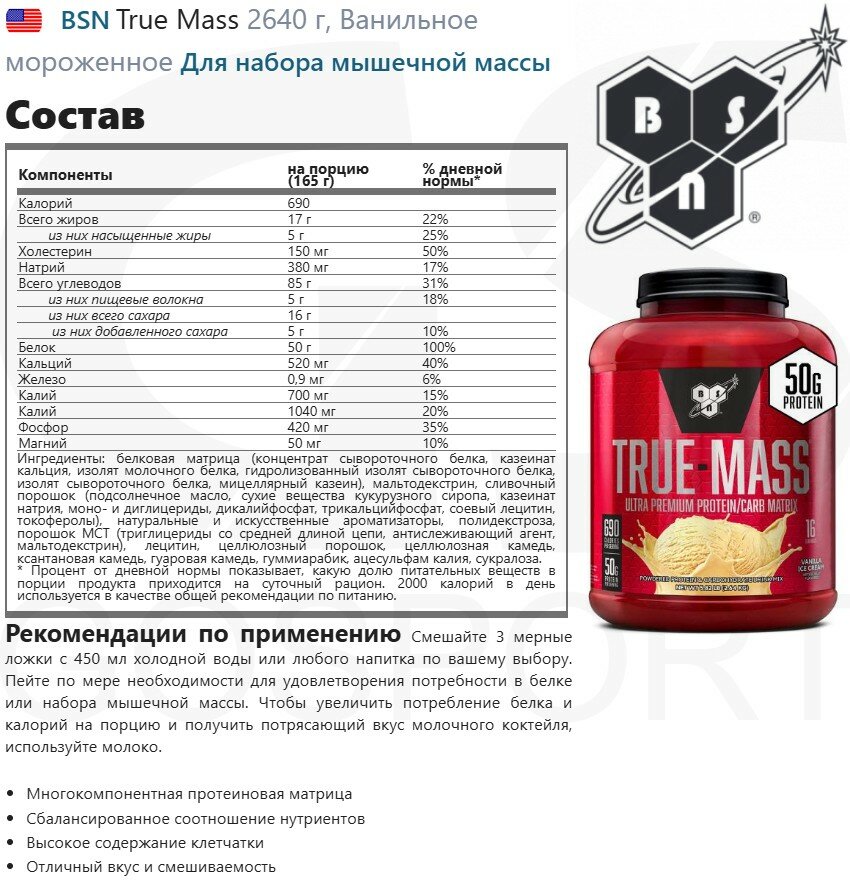 | Дополнительная информация | Незаменимых аминокислот (EAA) природного происхождения на порцию: 20 грамм Аминокислоты с разветвленной цепью (BCAA) природного происхождения на порцию*: 10 грамм Порошкообразная смесь для приготовления белково-углеводных напитков Для самого чистого набора мышечной массы; размер порции: 165 г; калорийность порции: 710 ккал; насыщенные жиры: 4 г; рекомендации по применению: Развести 3 мерных ложки в 480 граммах холодной воды или любого напитка по своему усмотрению. Для достижения желаемой консистенции напитка меняйте количество жидкости. Выпивайте одну порцию в день или по мере необходимости в удовлетворении ваших потребностей в белке или требований к набору мышечной массы.; состав: белковый комплекс: концентрат белка из сыворотки, казеинат кальция, изолят белка из молока, изолят белка из сыворотки, мицеллярный казеин, гидролизованный белок из сыворотки, яичный белок, глутаминовые пептиды, мальтодекстрин, подсолнечный порошок: подсолнечное масло, сухая кукурузная патока, казеинат натрия, моно- и диглицериды, гидроортофосфат калия, трикальцийфосфат, соевый лецитин и токоферолы, натуральные и искусственные ароматизаторы, полидекстроза, порошок со среднецепочечными триглицеридами: среднецепочечные триглицериды, обезжиренное сухое молоко, гидрофосфат натрия, диоксид кремния, карбоксиметилцеллюлоза, лецитин, ксантановая камедь, гуаровая камедь, гуммиарабик, соль, сукралоза, ацесульфам |