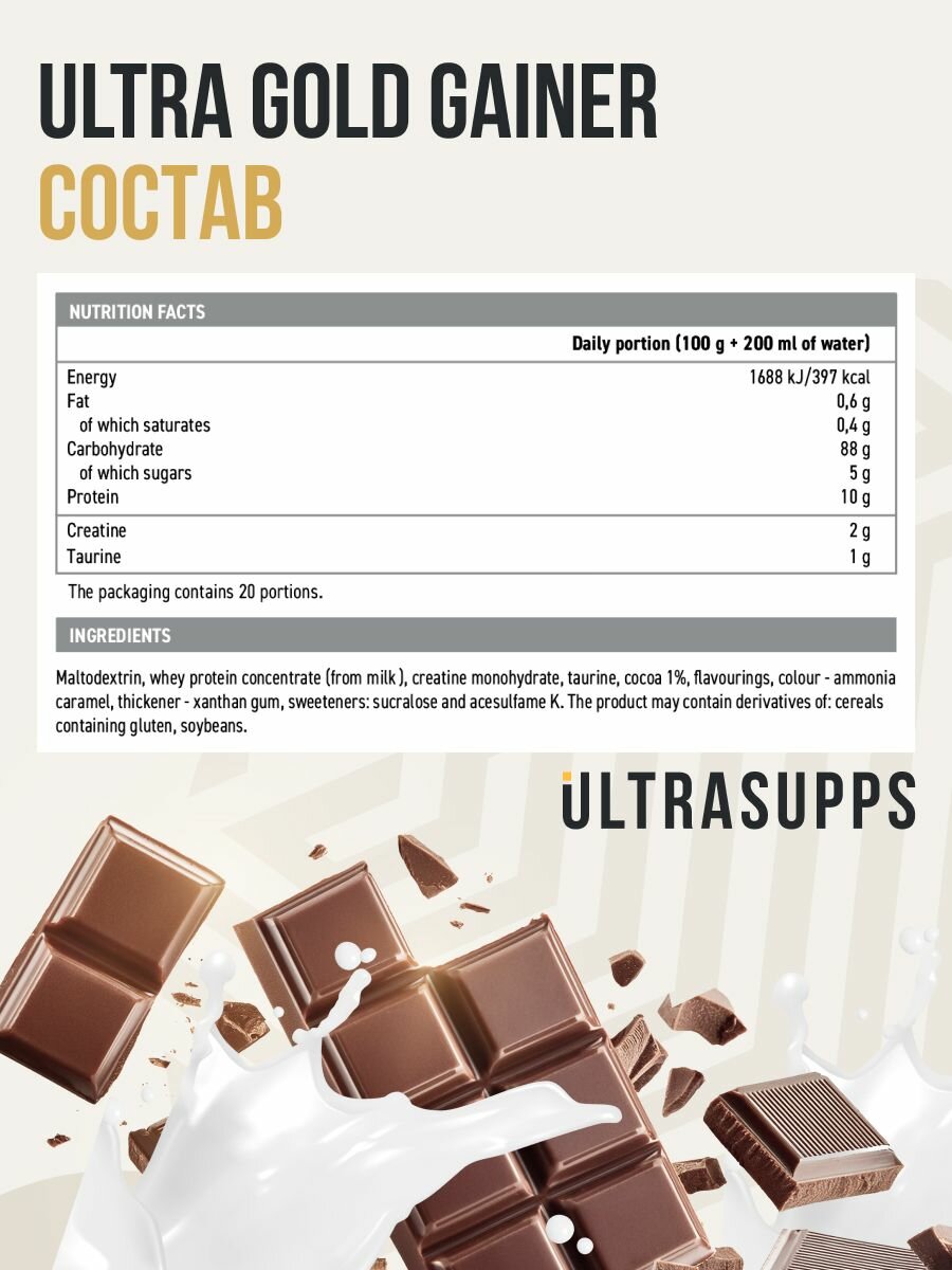 Гейнер для набора массы 20 порций UltraSupps 2 кг / Ultra Gold халяль, шоколад, для набора мышечной массы для мужчин: сравнение цен, характеристики, фото, актуальное наличие и цены.
