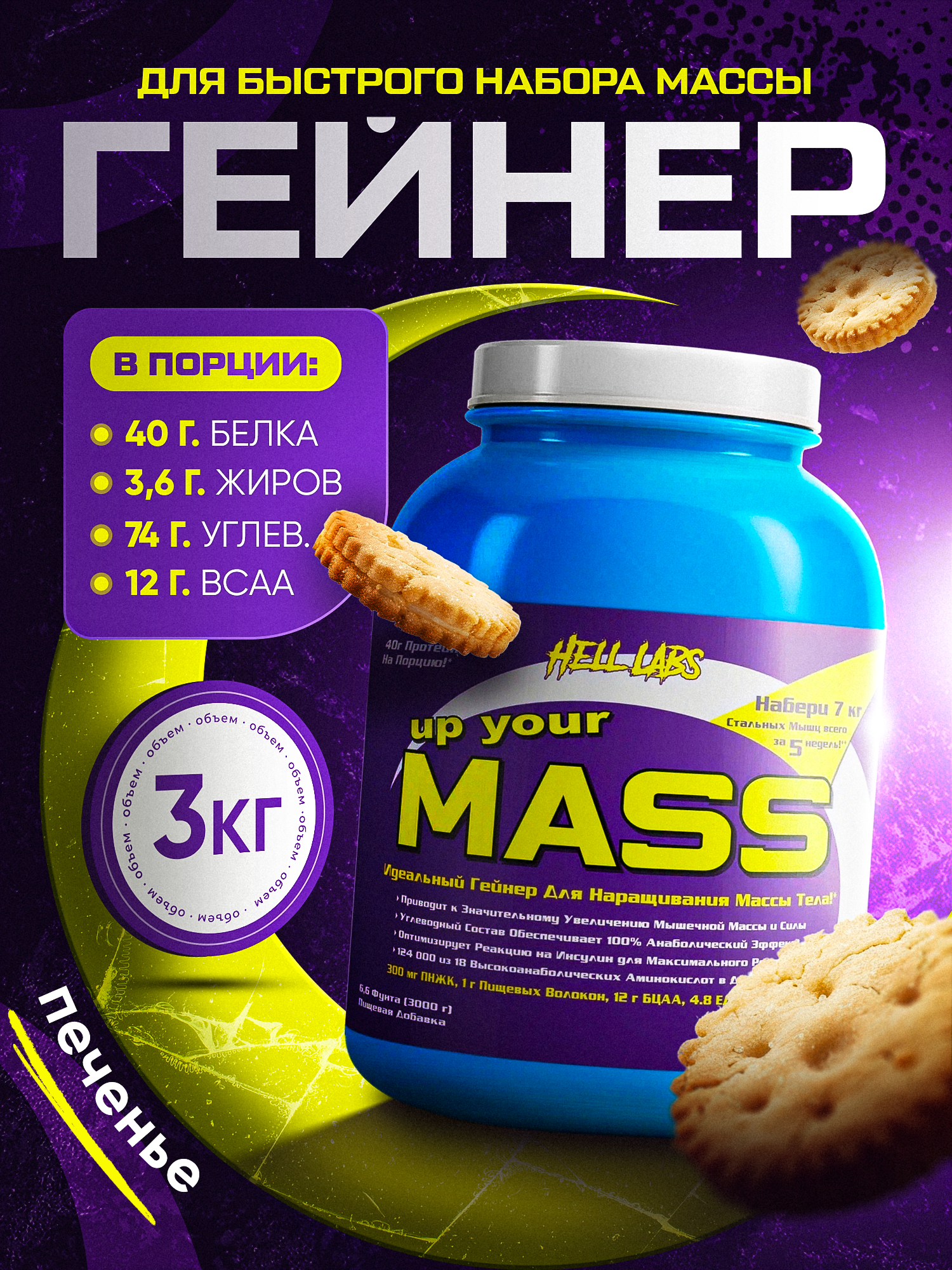 Гейнер Hell Labs «Up Your Mass 3000», печенье, 3 кг + шейкер: сравнение цен, характеристики, фото, актуальное наличие и цены.