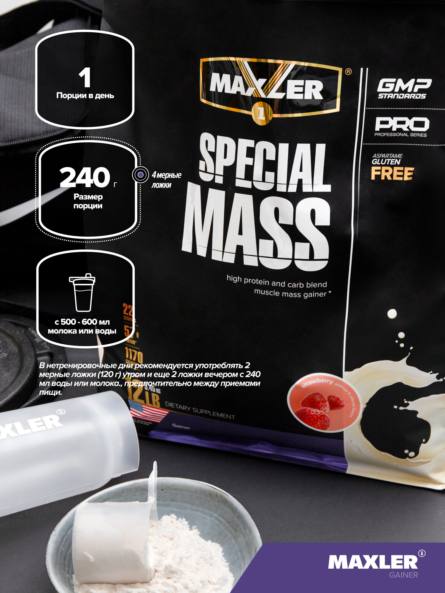 - Рекомендации по применению: в качестве диетической добавки смешайте 4 мерных ложки (240 г) Special Mass с 500-600 мл воды или молока. Для достижения наилучших результатов употребляйте одну полную порцию (240 г) Special Mass сразу после интенсивной тренировки. В нетренировочные дни рекомендуется употреблять 2 мерные ложки (120 г) утром и еще 2 ложки вечером, предпочтительно между приемами пищи. Смешайте каждую половину порции с 240 мл воды или молока. Вы можете использовать больше или меньше жидкости для достижения желаемой консистенции. Дополнительные порции можно употреблять в течение дня для удовлетворения суточной потребности в протеине и калориях.
