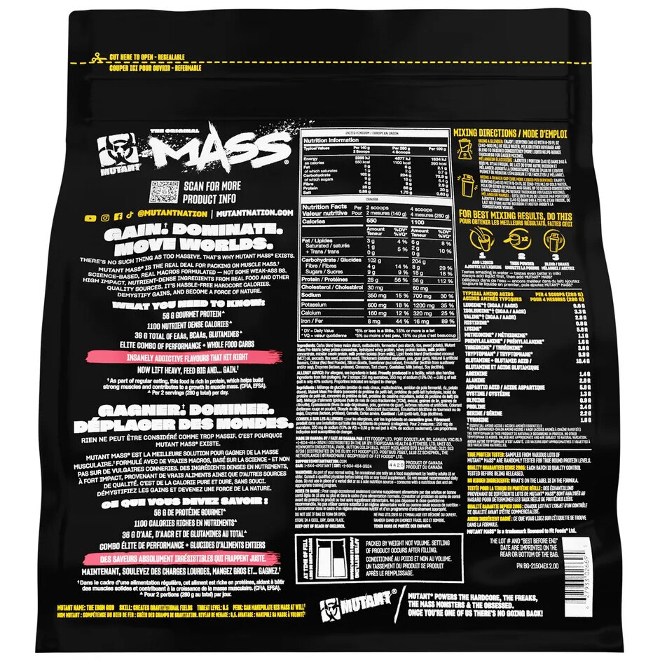 Гейнер Mutant Mass 5 lb Strawberry Banana 2270g (Клубника-банан)Белково-углеводная смесь Mutant Mass – это результат многочисленных исследований и тестирований, благодаря чему он считается одним из качественных высокоуглеводных гейнеров на современном рынке спортпита. Мутант Масс способствует быстрому росту мышечной массы, заметному улучшению силовых показателей и восстановления. Углеводная составляющая представляет собой сбалансированное соотношение компонентов различной сложности, что обеспечивает плавное поступление глюкозы в кровь. При этом в продукте содержится смесь веществ, которые дают только чистую энергию и мышечную массу, в то время как в других гейнерах присутствует очень много лактозы и сахара. Перед разработчиками гейнера была поставлена задача: подпитка мышц энергией в течение всего дня и сохранение резервов гликогена для резкого увеличения объемов мускулатуры. И эта задача решена! В каждой порции содержится многокомпонентная белковая матрица, вобравшая в себя около десяти качественных источников белка. Итак, к достоинствам высокоуглеводного гейнера Mutant MASS 6800г можно отнести: Высокую калорийность – свыше 1000 калорий (в полноценной порции); Оптимальный профиль аминокислот – 32г; Протеиновую матрицу из 10 видов белка – 52г; Наличие сложных и простых углеводов – 182г; Протеиновая матрица представляет собой сочетание сывороточных белков с яичным альбумином и казеином (в том числе и мицеллярным). Комбинация ингредиентов с быстрым, средним и медленным расщеплением способствует продолжительному и равномерному распределению аминокислот. Гейнер богат BCAA, глутамином и аргинином. Глутамин оказывает мощный антикатаболический эффект, а аргинин участвует во многих обменных процессах.«Mutant MASS – это сильный гейнер. Быть Мутантом означает выходить за рамки, не быть одним из многочисленных атлетов со средними показателями. Каждая порция обеспечивает организм множеством макроэлементов, подобранных специально для тех, кто не просто хочет быть атлетом, а желает стать MUTANT». Именно такой посыл несет новое поколение гейнеров канадского производителя Fit Foods. Этим объясняются проводимые компанией многочисленные исследования на бодибилдерах со всей планеты с очень высокими силовыми показателями. Благодаря таким тестированиям получился эффективный состав Mutant MASS, способствующий быстрому росту мышц. Состав: Восковая кукуруза, мальтодекстрин, концентрат сывороточного протеина и белковая смесь (концентраты сывороточного протеина, концентрат молочного протеина, изолят молочного протеина, мицеллярный казеин, казеинат кальция, изолят сывороточного протеина, гидролизат сывороточного протеина, модифицированные молочные ингредиенты, яичный белок/альбумин), загустители: обезжиренная соя, порошок кокосового масла со среднецепочечными триглицеридами (MCT) (кокосовое масло, сухая кукурузная патока, казеинат натрия, фосфат калия), эмульгатор: моно- и диглицериды, антислеживающий агент: диоксид кремния, консервант: диоксид серы (Е220), настоящие крошки печенья (обогащенная пшеничная мука [пшеничная мука, ниацин, восстановленное железо, мононитрат тиамина, рибофлавин, фолиевая кислота], сахар, рапсовое масло, какао [обработанное щелочью], соль, пищевая сода) (вкус: печенье и крем), глутаминовые пептиды (из пшеничного белка), порошок красной свёклы (вку