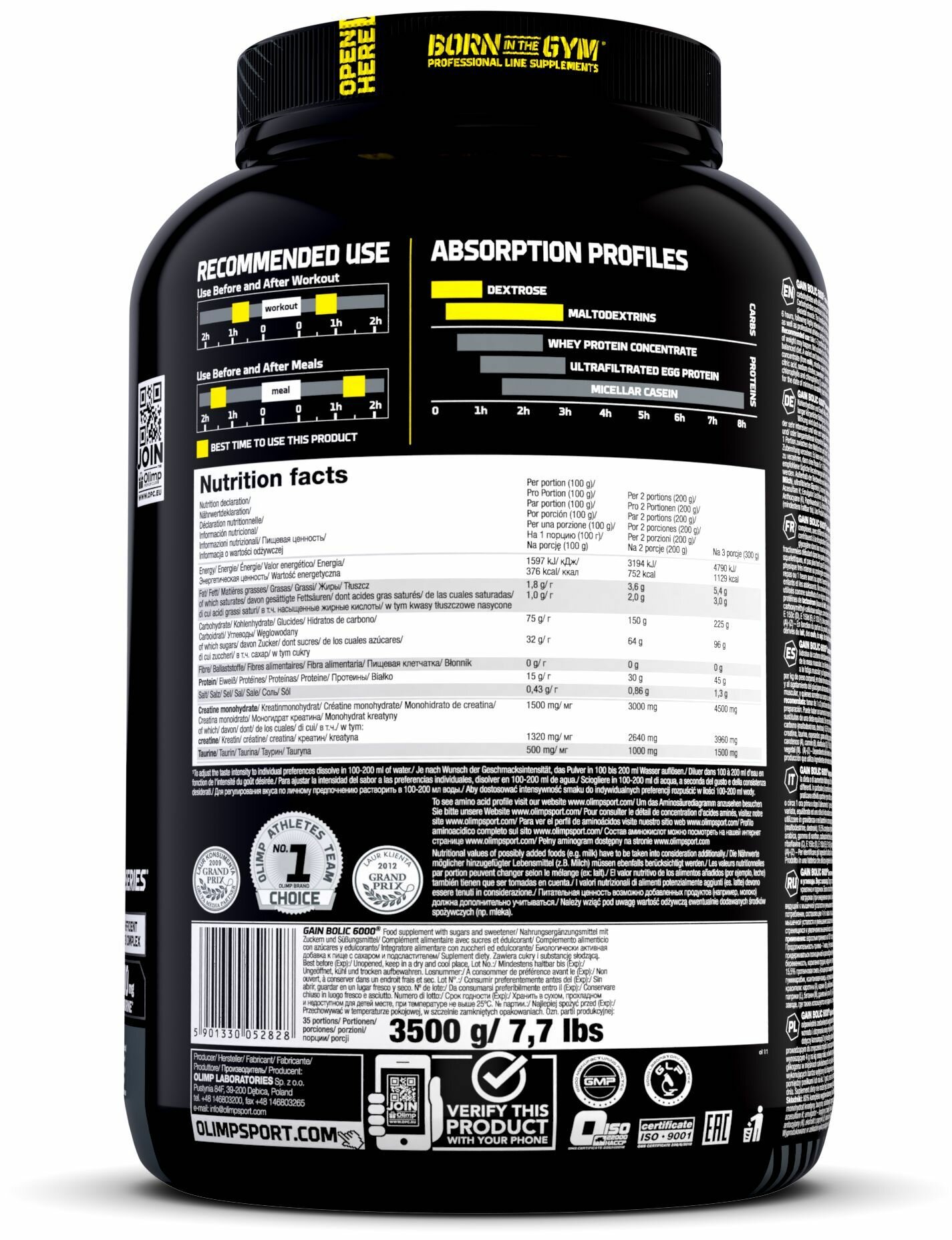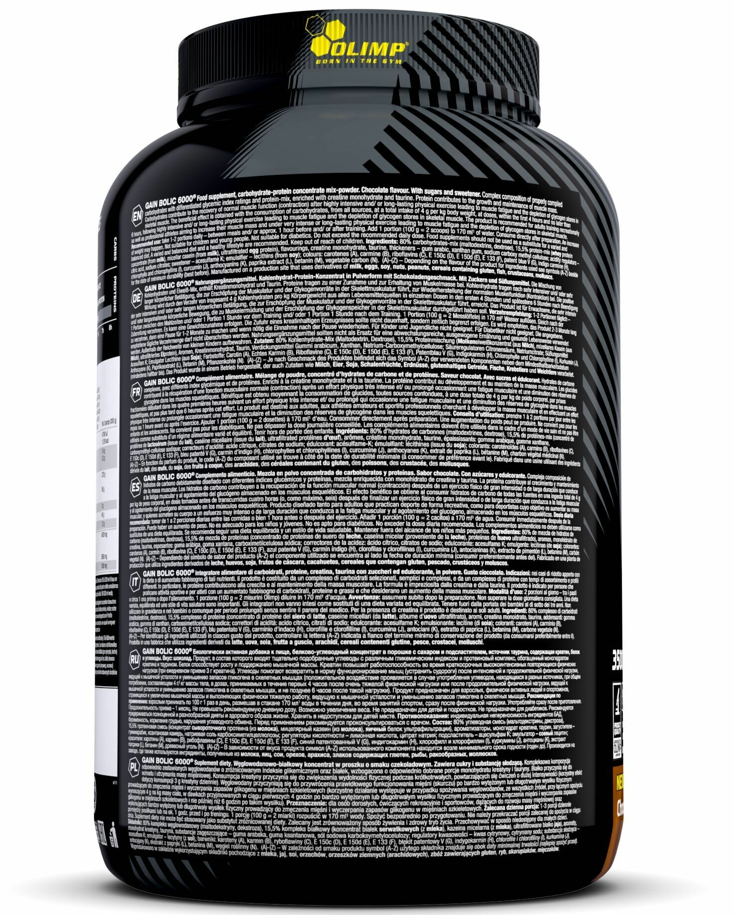 Olimp Gain Bolic 6000 это очень высококачественный продукт, для быстрого набора мышечной массы, особенно для людей, устойчивых к приобретению новой мышечной массы. Olimp Gain Bolic 6000 обеспечивает всеми питательными веществами, важными для быстрого развития мускульной силы и массы. Комплекс углеводов в Olimp Gain Bolic 6000 надлежащим образом составлен с различными гликимическими индексами, сывороточным белковым концентратом, казеином, яичным белком, обогащенный моногидратом креатина и таурином. Добавление креатина, декстроза и таурина, в определенном порядке и дозировке ускоряет и повышает активность анаболических процессов.