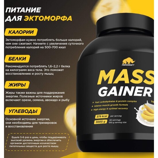Гейнер белково-углеводный PRIMEKRAFT/ MASS GAINER для набора массы со вкусом «Банан», 3 кг, банка