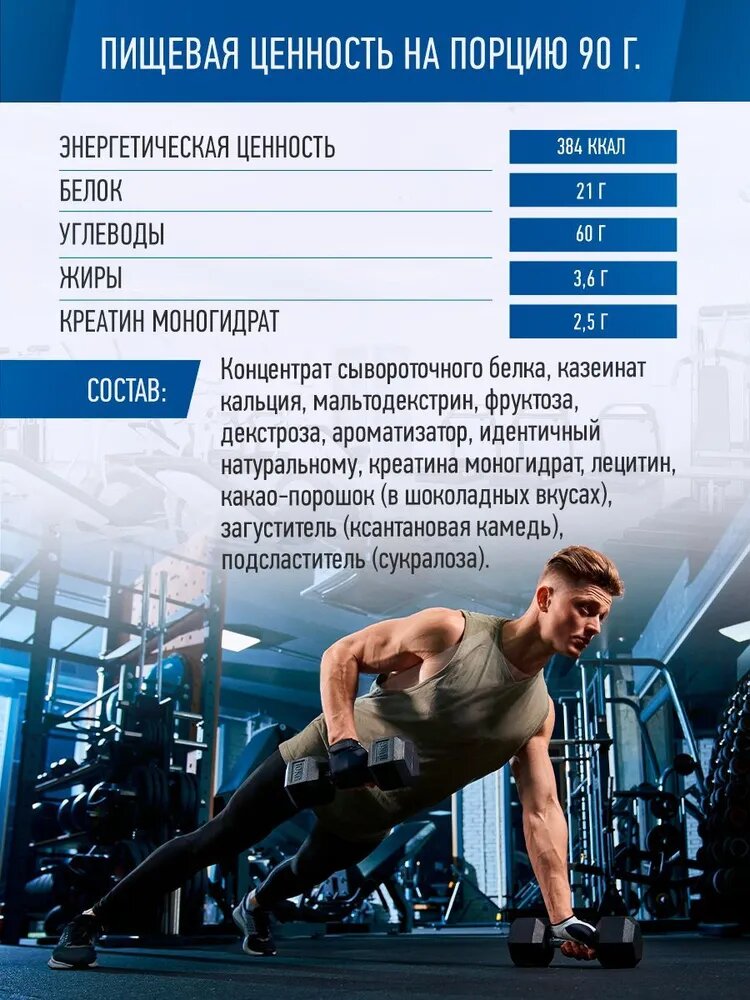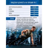 | Дополнительная информация | размер порции: 90 г; калорийность порции: 360 ккал; рекомендации по применению: Для получения одной порции необходимо смешать полтора мерных стакана (90г) порошка с 250-500 мл воды или обезжиреного молока. Принимать за 1-1,5 часа до тренировки и в течение 30 мин после. Так же можно добавить еще один прием утром. В дни отдыха - один раз между приемами пищи.; состав: концентрат белка молочной сыворотки, полученный методом ультрафильтрации (КСБ-УФ), казеинат кальция, мальтодекстрин, фруктоза, декстроза, крахмал из кукурузы восковой зрелости, ароматизатор идентичный натуральному, лецитин, сухой растительный жир, креатина моногидрат, какао-порошок (в шоколадном вкусе), ксантановая камедь, подсластитель, витаминный премикс. Информация для аллергиков: содержит лактозу. |