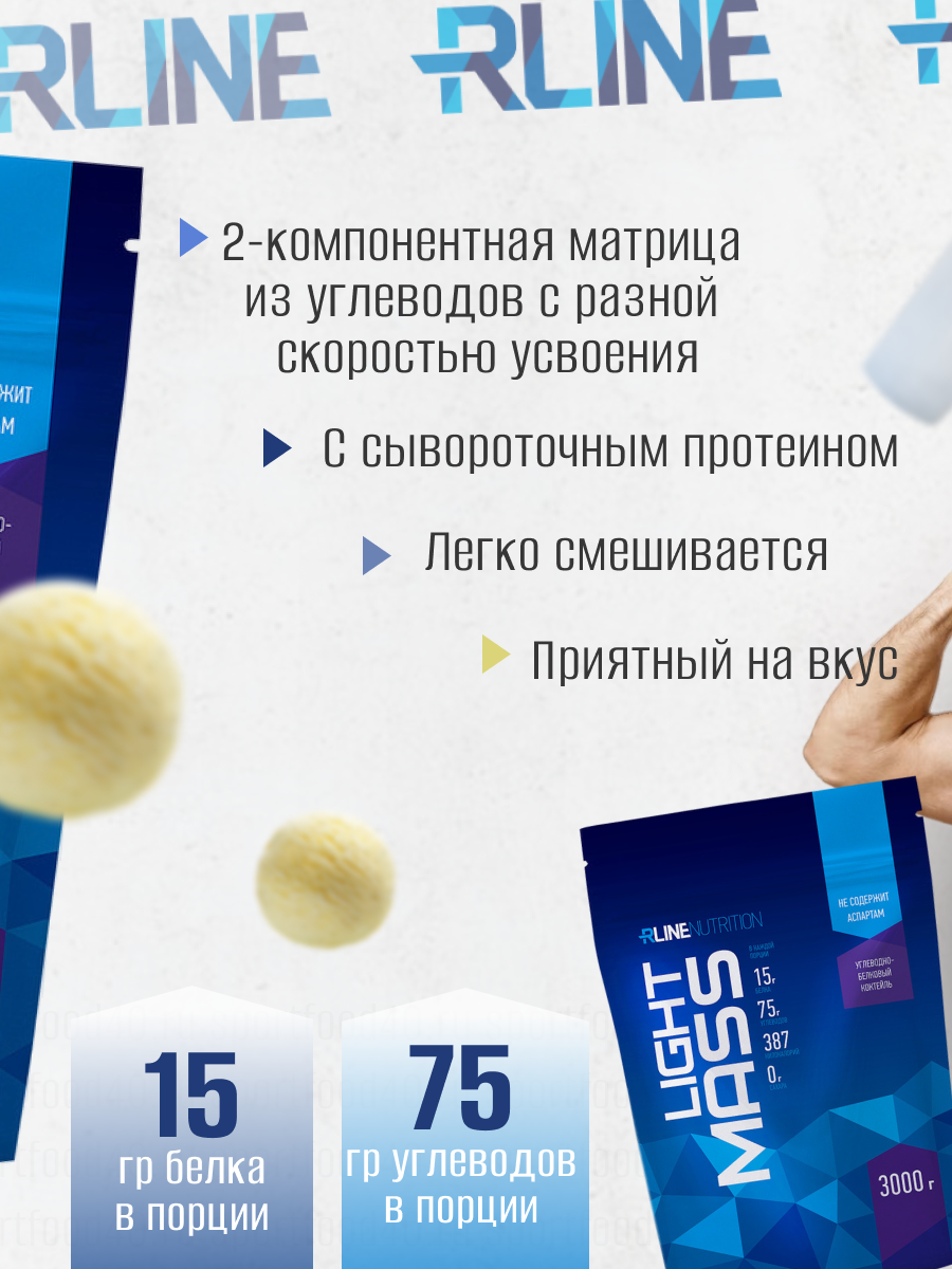 Высокоуглеводный гейнер Light Mass разработан технологами RLine для ускорения наращивания мышечной массы. Этот процесс является наиболее энергозатратным. Чтобы обеспечить его избыточной энергией, разработчики сместили соотношение компонентов Light Mass в сторону углеводов. Это позволило создать формулу для успешного форсирования спортивных результатов. Light Mass снимает ограничения с потенциала роста. Продукт рекомендован атлетам с высоким уровнем метаболизма. Позволяет увеличить калорийность рациона без дополнительной нагрузки на пищеварительный тракт.