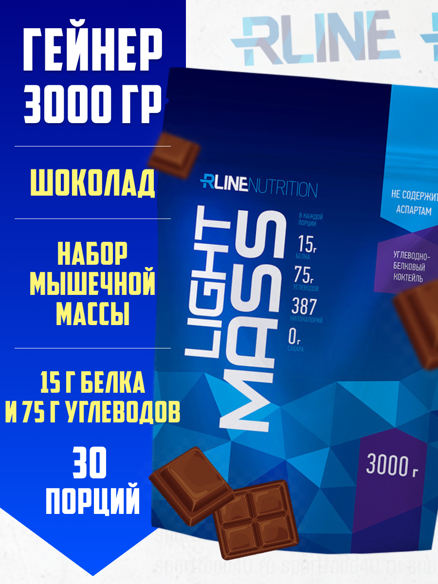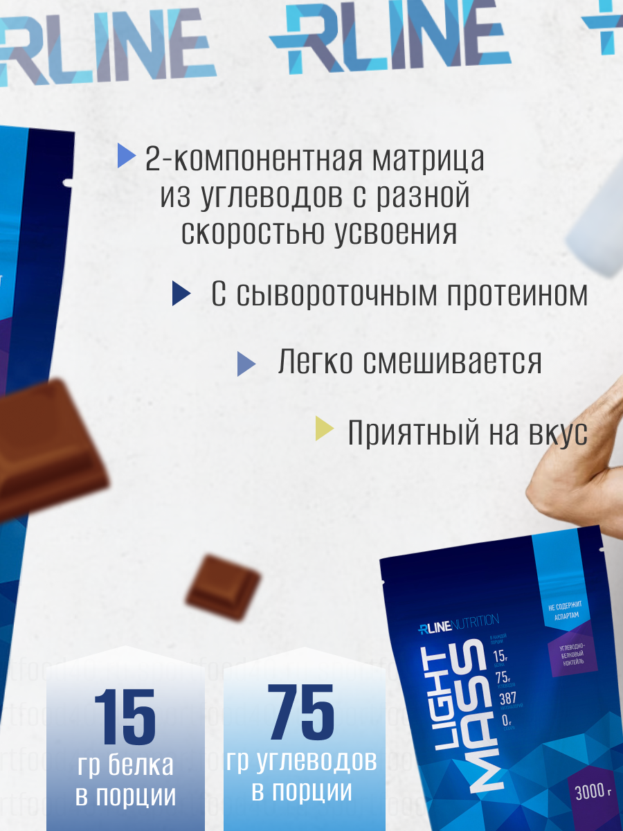 Высокоуглеводный гейнер Light Mass разработан технологами RLine для ускорения наращивания мышечной массы. Этот процесс является наиболее энергозатратным. Чтобы обеспечить его избыточной энергией, разработчики сместили соотношение компонентов Light Mass в сторону углеводов. Это позволило создать формулу для успешного форсирования спортивных результатов. Light Mass снимает ограничения с потенциала роста. Продукт рекомендован атлетам с высоким уровнем метаболизма. Позволяет увеличить калорийность рациона без дополнительной нагрузки на пищеварительный тракт.