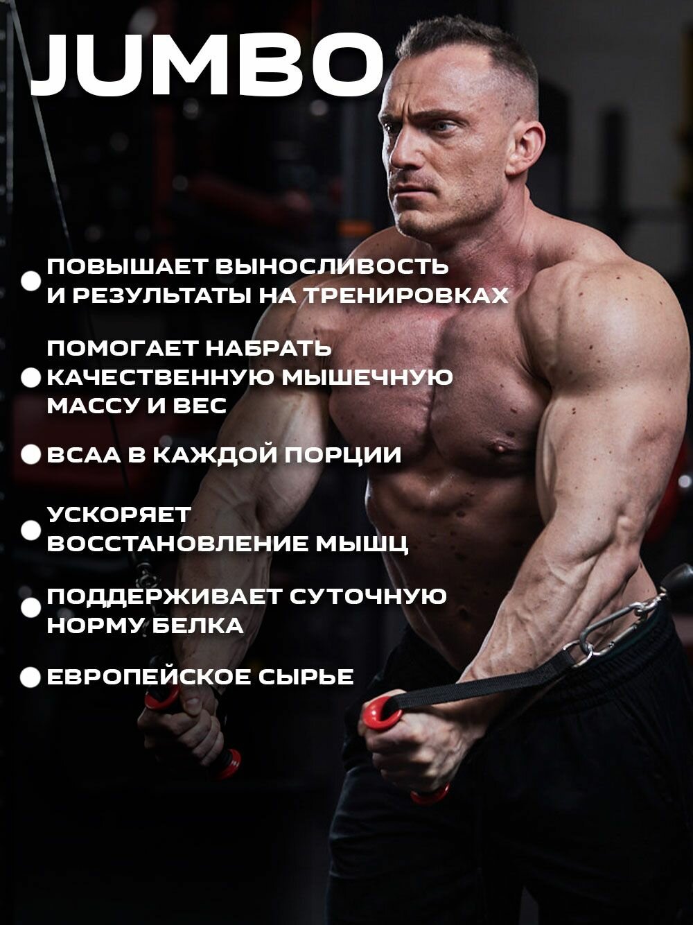 Протеиновая составляющая Jumbo состоит из ультрафильтрованного сывороточного концентрата, который богат аминокислотами, в том числе, незаменимыми. Обладая высокой скоростью абсорбции, аминокислоты из сывороточного протеина моментально всасываются в кровь и насыщают мышечные волокна, обеспечивая их строительными компонентами.