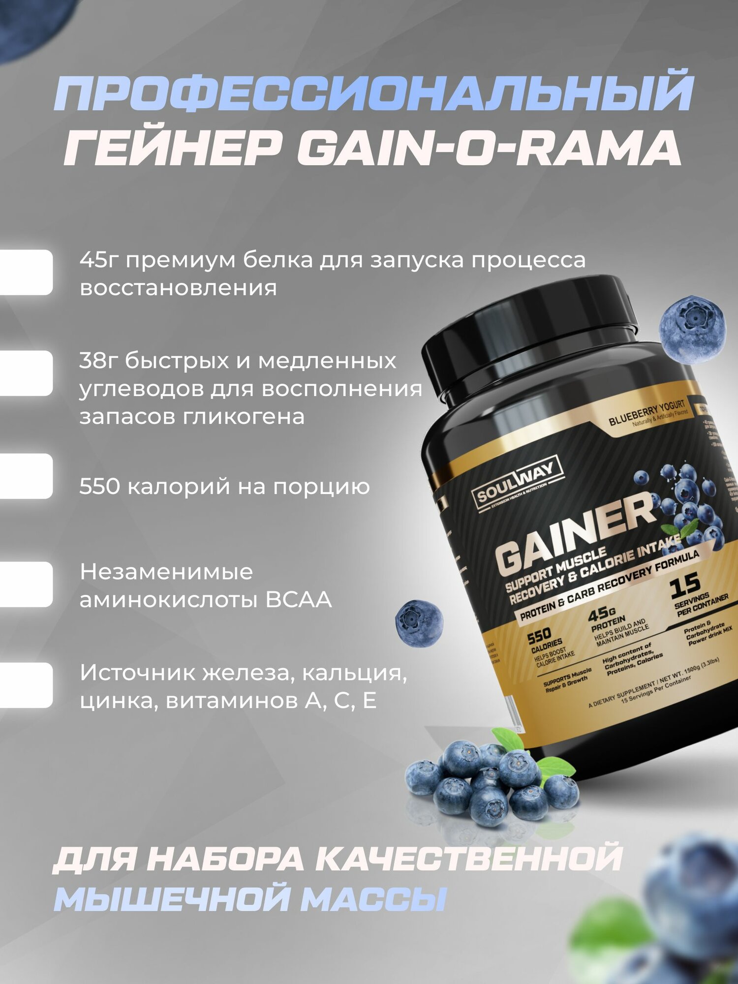 Добро пожаловать в мир нашего бренда Soul Way! Мы - команда энтузиастов, создающих уникальные продукты для достижения ваших спортивных целей. С гордостью представляем вам наш последний триумф - гейнер со вкусом черники для приготовления коктейлей.