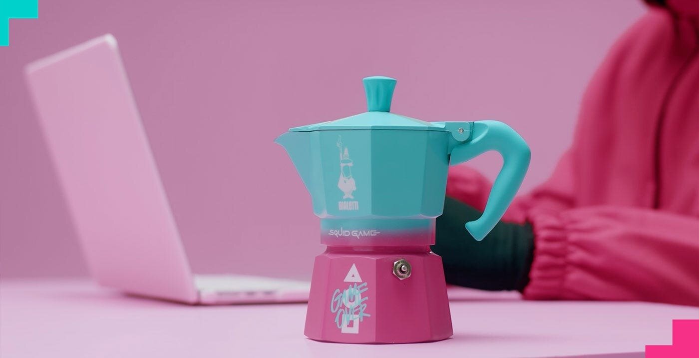 Купить Гейзерная кофеварка Bialetti Moka Express Игра в кальмара розово-голубая, 3 порции, 130 мл с доставкой по всей России.