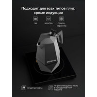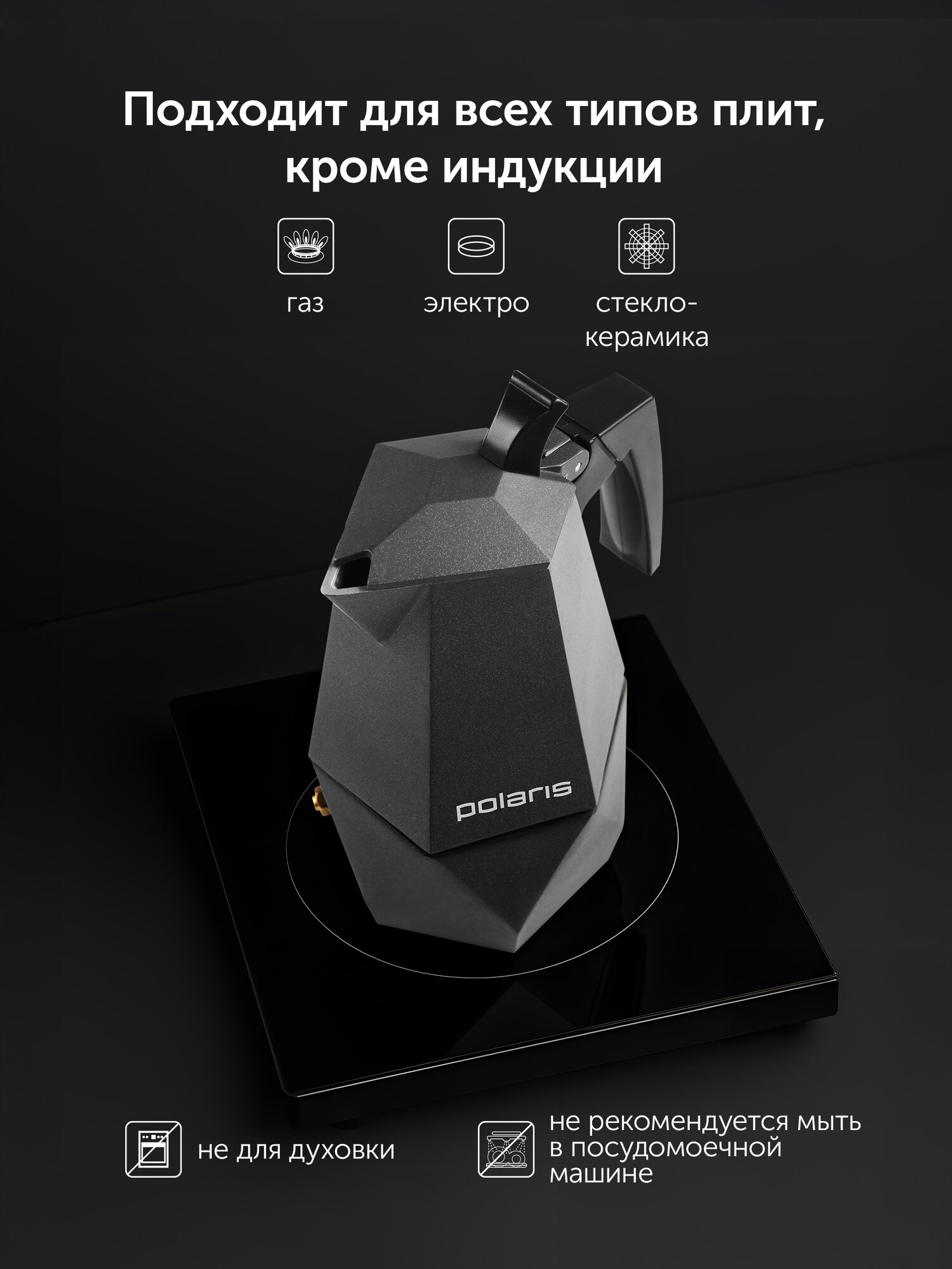 съемный резервуар для кофе, откидная крышка, разборная конструкция; подходит для всех типов плит, кроме индукционных.