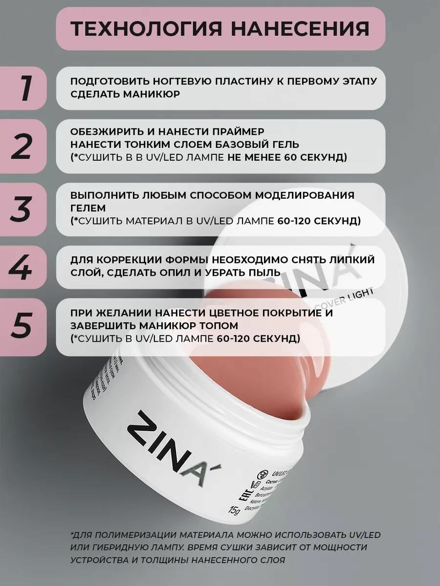 Гель для наращивания и моделирования ZINA Cover Light — 100 грамм, нюд, глянцевый, для френча, прочный для лампы, для лампы UV LED: сравнение цен, характеристики, фото, актуальное наличие и цены.
