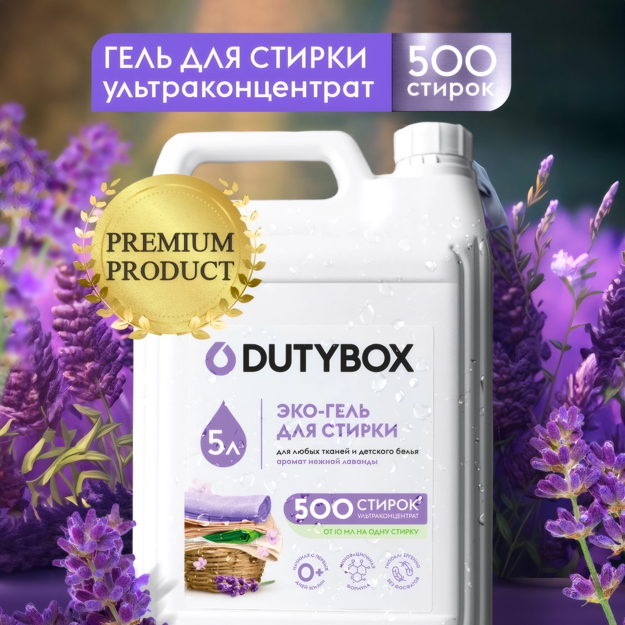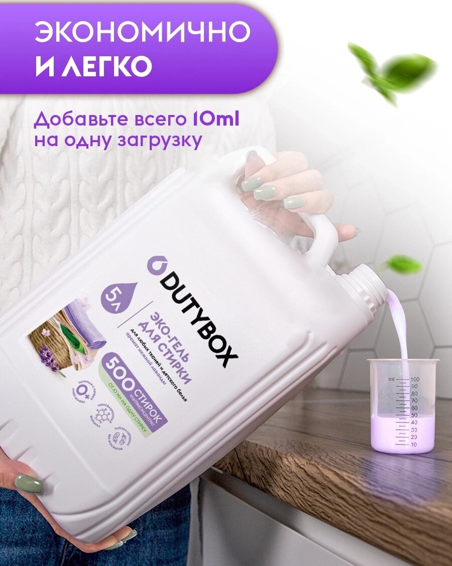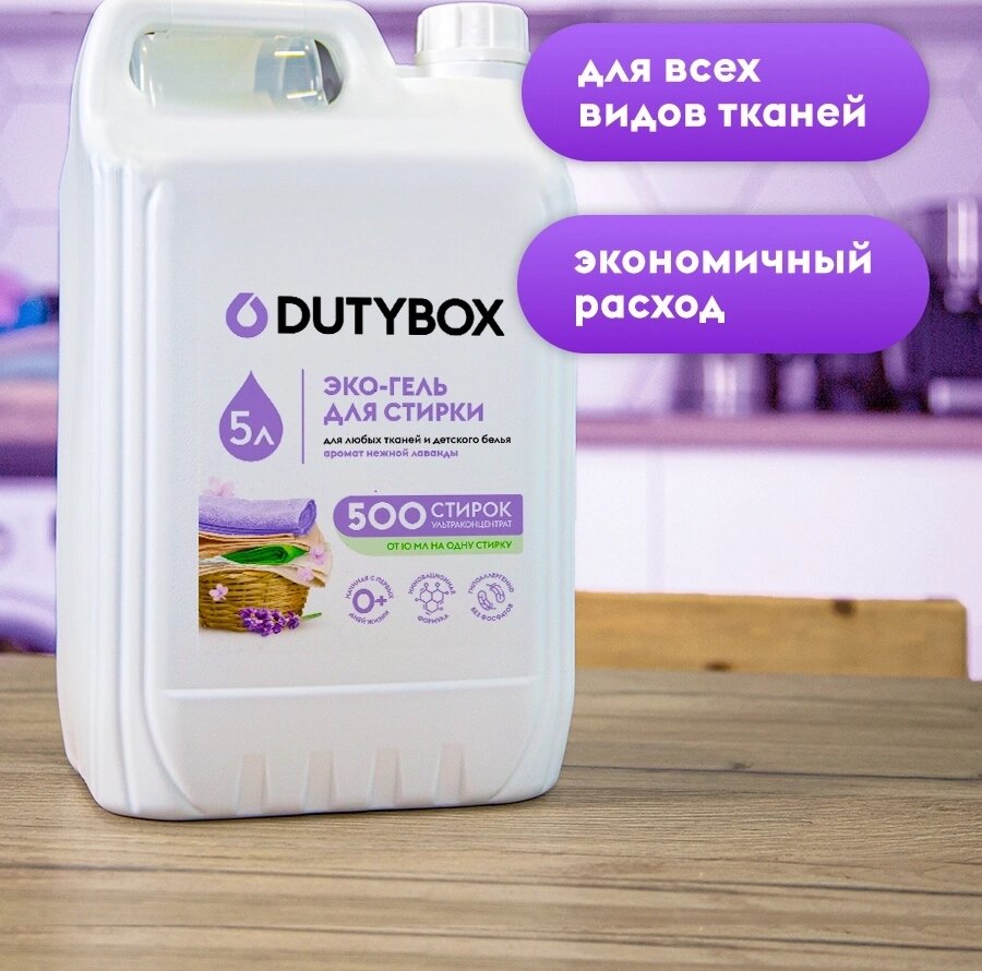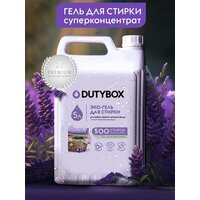 DUTYBOX Концентрированный Гель для стирки 5лЭко гель для стирки Dutybox с ароматом Лаванды, универсальный, для всех типов ткани в ассортименте 1л, 5л и саше. На одну стирку потребуется всего от 10 до 20 мл геля концентрата (1 литр хватит до 100, 5 литров - до 500 применений). Покупать концентрат Дьютибокс выгодное и удобное решение для вашего дома. Для любых видов тканейСредство подходит для различных типов ткани (белого, черного, цветного) из шелка и шерсти, для стирки пуховиков, спортивной одежды (мембранных тканей). Гипоаллергенный состав подходит для стирки детских вещей ( для новорожденных, 0+ ) и для людей с чувствительной кожей. Жидкий стиральный порошок Дьютибокс выполаскивается из волокон ткани на 100%, не остается на одежде, подходит для машинной и ручной стирки. Способ применения: Жидкое средство для стирки с помощью мерного колпачка налить в специальный отсек стиральной машины. Стирать при температуре от 15С до 40С. Дозировка: стирка автомат на 3-5 кг 20 мл, 6-8 кг 30 мл. ручная стирка: 10 мл концентрата на 10 литров воды. . Перед стиркой ознакомьтесь с информацией на ярлыке изделия. Ручная стирка: разведите 5 мл концентрата в 10 литрах воды. Выстирайте белье, тщательно прополощите и высушите. Для въевшихся пятен рекомендуем дополнительное использование пятновыводителя.