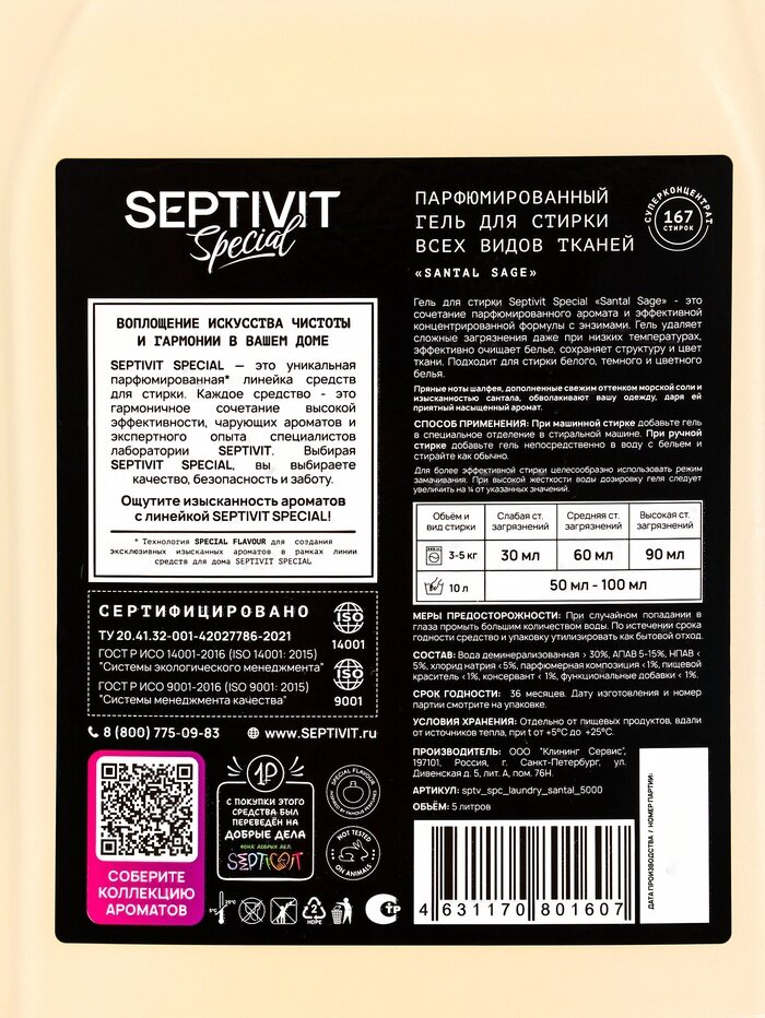 Гель для стирки Septivit Special Santal Sage, парфюмированный, для всех видов тканей, 5 л: сравнение цен, характеристики, фото, актуальное наличие и цены.