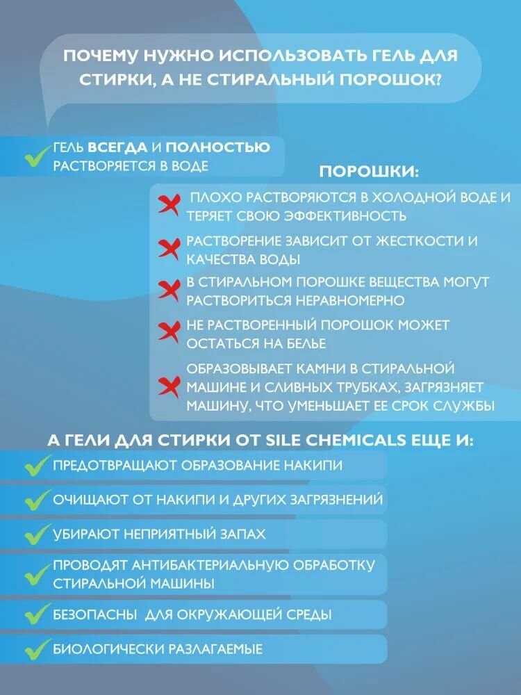 Предотвращает образование накипи, неприятного запаха, производит антибактериальную обработку как самих тканей, так и стиральной машины.
