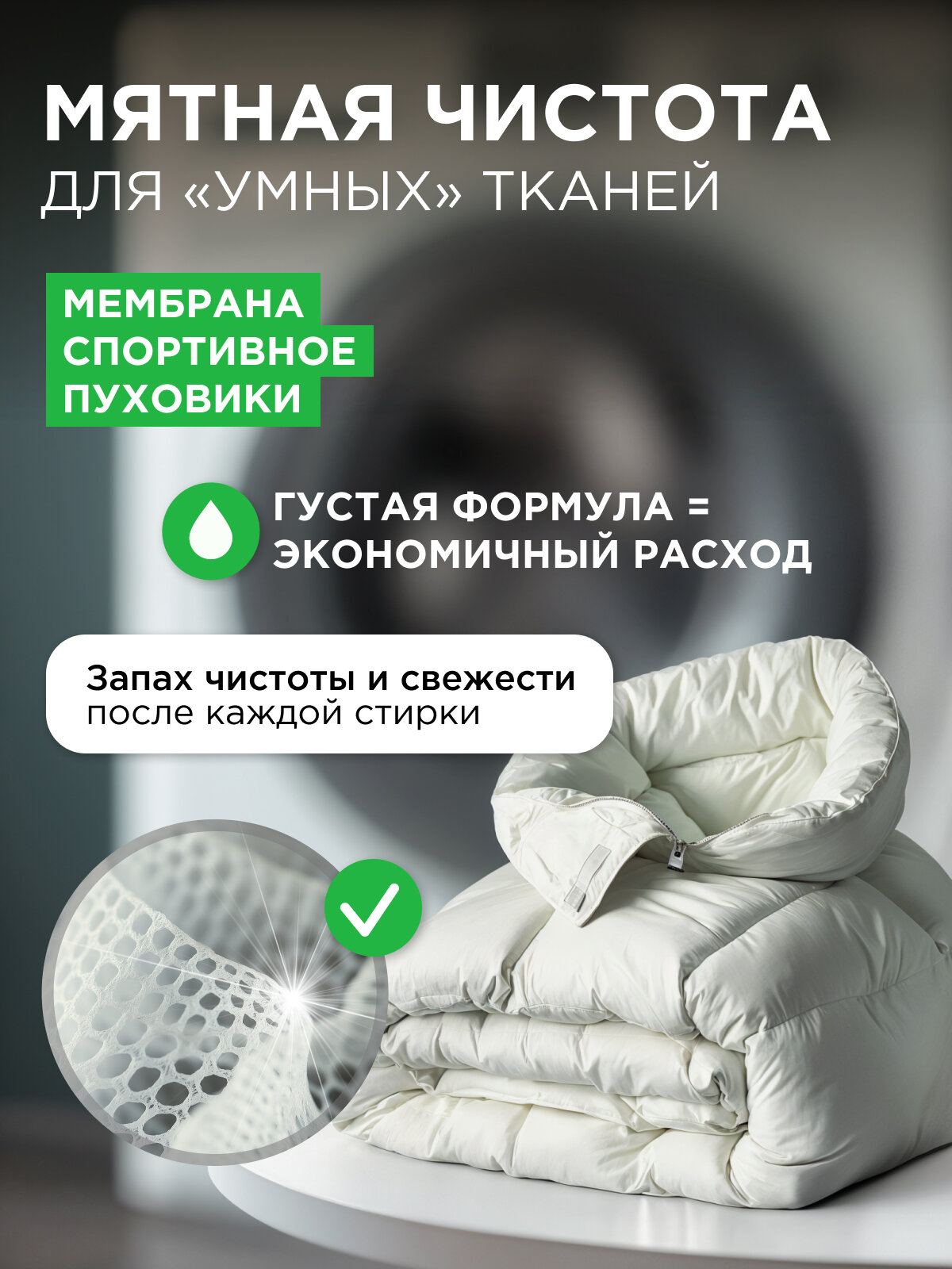 антибактериальный, антистатический, водоотталкивающий, восстановление цвета, отбеливание, придание мягкости, устранение неприятных запахов