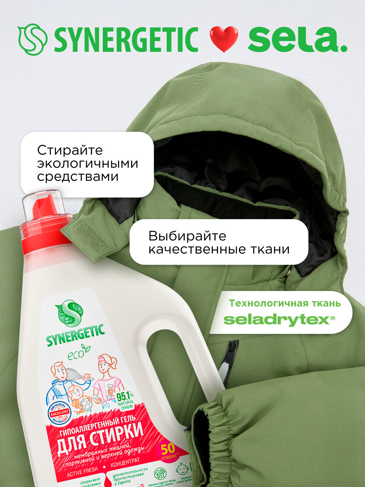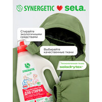 Биоразлагаемый концентрированный гель для стирки мембранных тканей, спортивной и верхней одежды SYNERGETIC ACTIVE FRESH обеспечивает бережное и эффективное очищение тканей, гигиеническую чистоту одежды и устраняет неприятные запахи. Средство можно использовать в стиральных машинах любого типа и при ручной стирке при температуре 15 - 90 °C. Комбинация энзимов и растительных ПАВ эффективно удаляет трудновыводимые и свежие пятна с волокон ткани даже в холодной жесткой воде и при коротких циклах стирки. Функциональные добавки предотвращают повторное оседание загрязнений на ткани, сохраняя ее первоначальный вид, прочность и структуру, а также водоотталкивающие свойства мембран. Активные компоненты препятствуют образованию катышков, делая волокна более гладкими. Гипоаллергенная отдушка на основе эфирных масел мяты, чайного дерева и эвкалипта оставляет легкий и приятный аромат. Гель подходит для стирки спортивной и верхней одежды, в том числе пуховиков и комбинезонов, обуви, мембранных и других высокотехнологичных водоотводящих и согревающих материалов: микрофибры, флиса, спандекса, тканей Teflon и Gore-Tex. Биоразлагаемый гель полностью выполаскивается из тканей, подходит для стирки детского белья 0+ и одежды людей с чувствительной кожей.