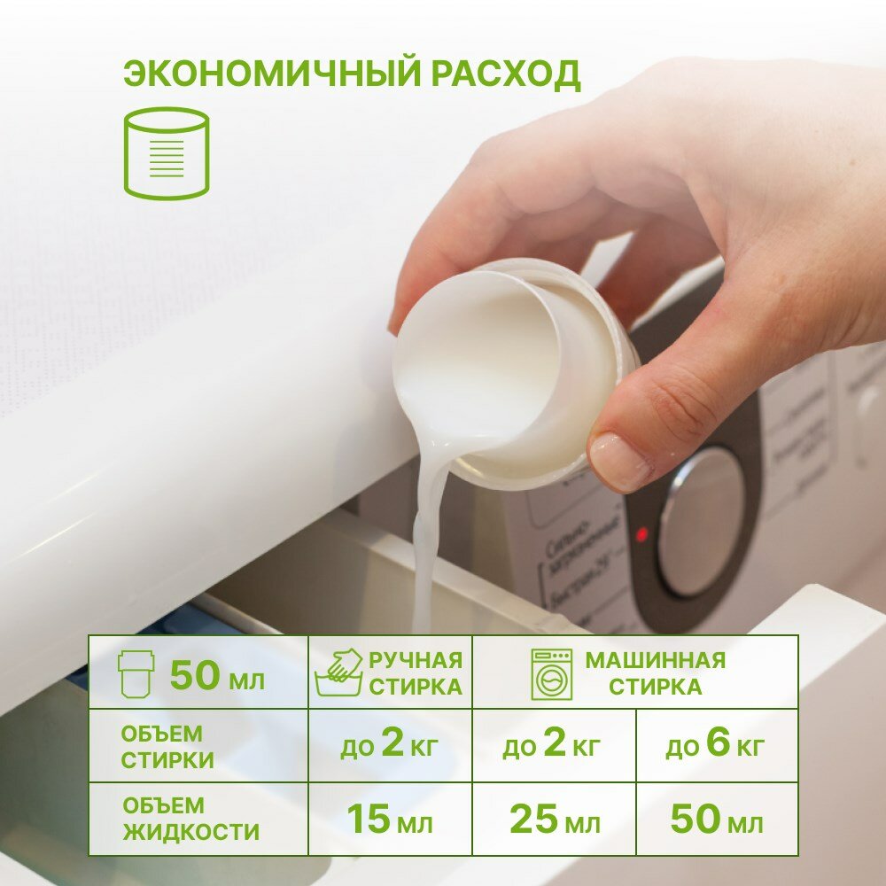 Концентрированное эффективное и безопасное средство для стирки всех видов тканей. Подходит для одежды и постельного белья детей с первых дней жизни и людей с чувствительной кожей. Отлично отстирывает любые загрязнения даже в жесткой и холодной воде. Препятствует образованию желтизны, сохраняет форму вещей и структуру ткани. Удобная эргономичная крышка бутылочки является дозировочным колпачком и равна 25мл. Экономичный расход: 1-2 колпачка на стирку, в зависимости от объема стирки. Подходит для всех типов стиральных машин и ручной стирки. Подходит для стирки детских вещей с первых дней жизни. Полностью выполаскивается водой и не оставляет разводов на вещах. Особая гипоаллергенная формула. Без фосфатов и красителей. Сохраняет цвет и структуру волокна. Экономичный расход. Для всех типов стиральных машин и ручной стирки.