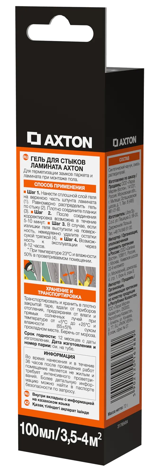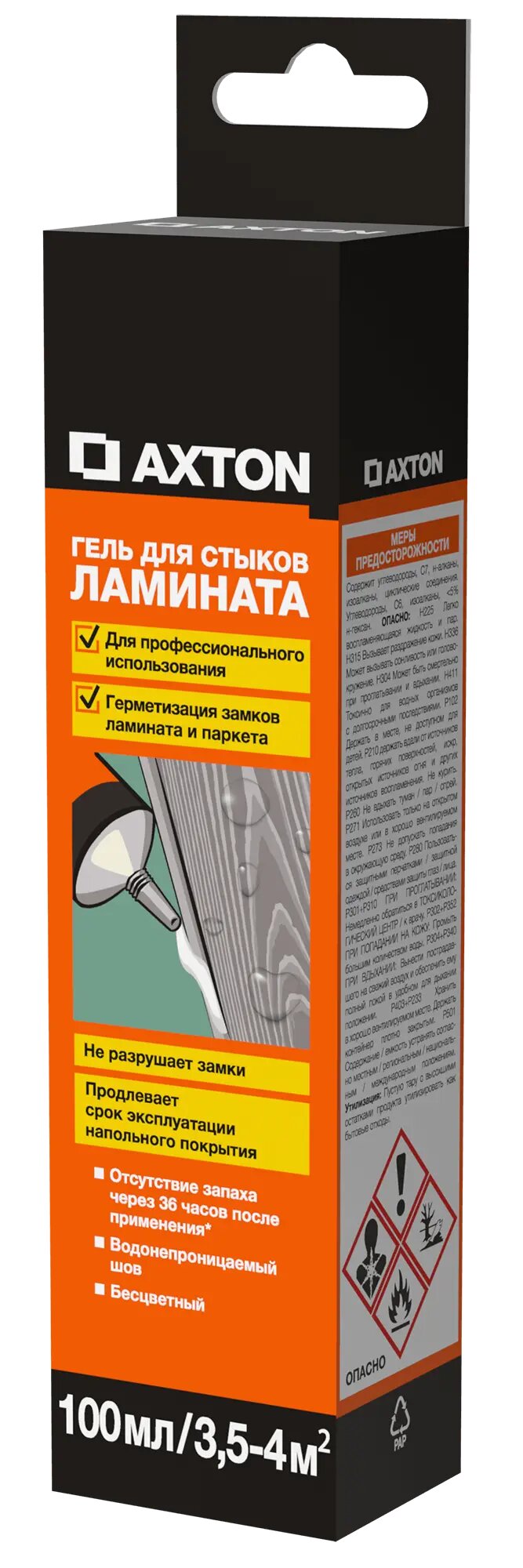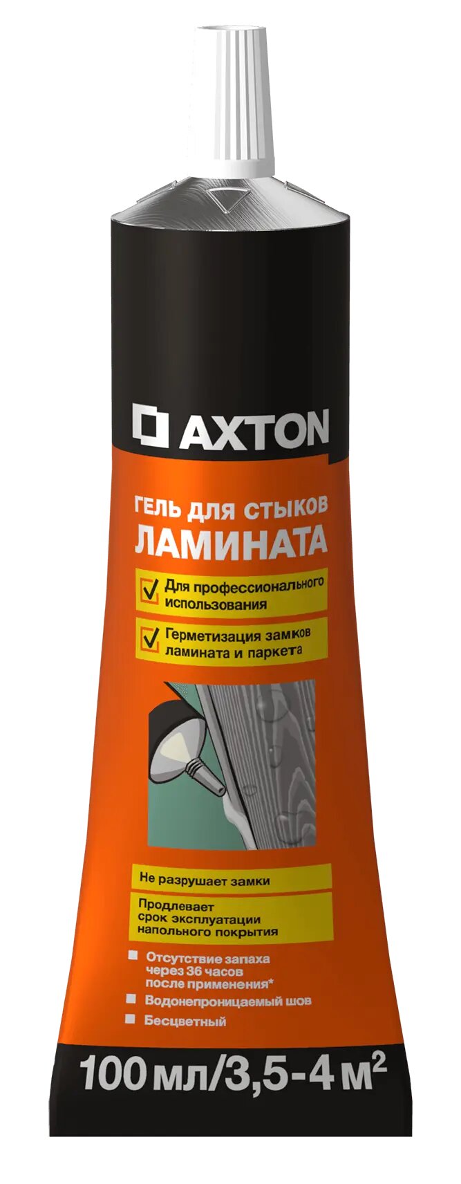 Гель для стыков ламината Axton — однокомпонентный, эластичный герметик, отверждающийся под воздействием влажности воздуха, предназначен для герметизации и соединения швов, а также для защиты от влажности. Содержит специально подобранный состав средств предотвращающих появление и развитие грибков, плесени, водорослей и т. д. Одно из них, благодаря своей капсульной форме, обеспечивает длительное воздействие, так как значительно медленнее вымывается. Это последнее поколение фунгицидов обеспечивает долгосрочную чистоту мест особенно подверженным воздействию грибка, дополнительно является абсолютно безопасным для пользователя. Предназначен для герметизации ванн, умывальников, душевых кабин, другого санитарного оборудования и водопроводов, соединения керамических плиток, уплотнения соединений и дилатационных щелей, мелких ремонтных работ по дому.