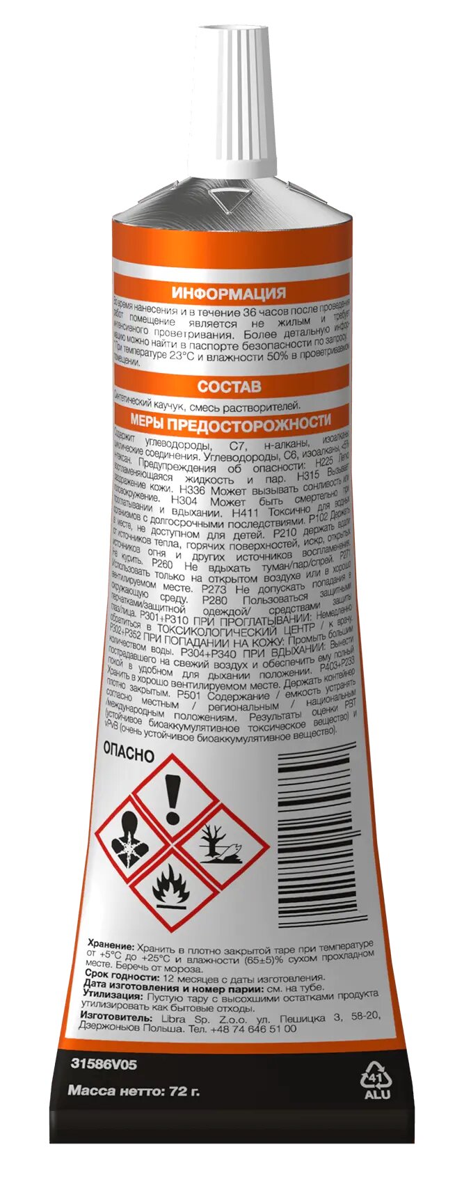 - Изготовлено из синтетического каучука со смесью растворителей — горючих веществ, обладающих резким запахом.