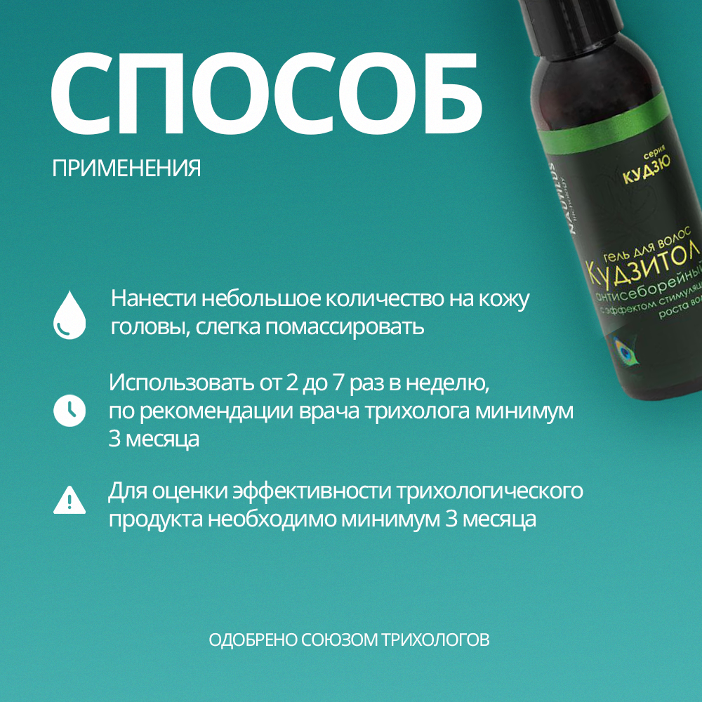 Разделить область волосистой части головы на 8-10 проборов. На каждый пробор нанести небольшое количество геля Кудзитол из расчета 0,4-0,6 мл. на каждый пробор. Средство наносить на ночь, утром смыть шампунем, подходящим для типа ваших волос.