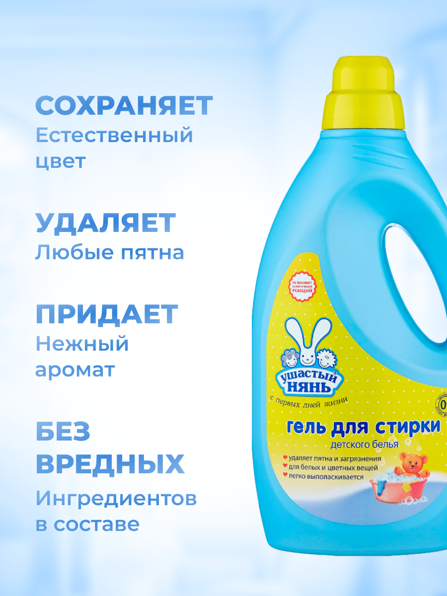 Жидкое средство для стирки детского белья «Ушастый нянь» 2000мл. Для стирки детского белья, в том числе новорожденных, из хлопчатобумажных, льняных, синтетических тканей, а также тканей из смешанных волокон (кроме изделий из натурального шелка и шерсти) в автоматических стиральных машинах, машинах активаторного типа и вручную. специально создано для стирки детского белья, в том числе новорожденных эффективно удаляет специфические «детские» пятна и загрязнения уже при 30-40ºС, включая пятна от сока, фруктов, ягод, травы, шоколада, крови быстро растворяется в воде полностью выполаскивается, подходит для стирки белых и цветных вещей, т. к. содержит цветосберегающий комплекс, удобная гель- формула не пылит и всегда точно дозируется с помощью колпачка-мерника благодаря двойным стенкам колпачка, после дозировки средство стекает внутрь флакона, оставляя флакон чистым и сухим подходит для стирки одежды всей семьи Не содержит красителей и хлора. Средство гипоаллергенно, подтверждено фбун Северо-Западным научным центром гигиены и общественного здоровья. По результатам премии «Отметка родителей-2017» гель для стирки детского белья «Ушастый нянь» награжден Золотым дипломом в номинации «Лучший гель для стирки детского». активные компоненты Цветосберегающий комплекс Цветосберегающие компоненты позволяют использовать продукт для стирки изделий из окрашенных тканей. Энзимы (ферменты) удаляют загрязнения и пятна различного происхождения. Оптический отбеливатель придает интенсивную белизну ткани.