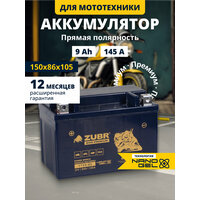 Мото аккумулятор 9 ач ZUBR PREMIUM YTX9-BS(GEL) (оем номера СТ 1209; YTX9-BS; MT 12-9; SMT 12-9; YTX9-BS-Gel; EB9-4; MX9-4; CTX9-BS; PTX9-BS) гарантирует длительный срок службы и превосходную производительность даже в самых экстремальных условиях. Для того, чтобы получить истинное удовольствие от скорости и качества езды, у мотоцикла должен быть не только мощный двигатель, но также и надежный аккумулятор. Правильно подобранный акб на мотоцикл – гарантия длительной поездки и нормального запуска ДВС. Линейка аккумуляторных батарей ZUBR отличается высокой герметичностью и вибростойкостью, имеет прочный корпус из ударостойкого пластика. Долговечность и высокая энергоемкость аккумулятора мотоциклетного 12v гарантируют долгую бесперебойную работу мотобайка. Аккумуляторы для мотоцикла гелевые 12в обладают высокой стартовой мощностью и повышенной энергоотдачей, являются универсальными, подходят для пуска двигателей мототехники: мотоцикл альфа, урал, электро мопед, иж планета юпитер, скутер электрический китайский, гидроцикл, квадроцикл, снегоход, снегоуборщик, снегоочиститель, багги, мотовездеход, питбайк 125, пит байк, трицикл, электротрицикл, мотособака, мотобуксировщик, снегоуборщик, бензогенератор, генератор и др. Аккумулятор мото 12 вольт на альфу GEL отличается стойкостью к глубокому разряду и воздействию низких температур, является необслуживаемым. Мото аксессуары эндуро мужские имеют высокий показатель пускового тока и срок службы более пяти лет. Основные преимущества аккумулятора для мопеда альфа: полностью герметичная конструкция, не допускающая утечку электролита; система внутренней рекомбинации газа акб для скутера 12 в исключает необходимость долива дистиллята; повышенные стартовые характеристики; компактность; высокая устойчивость к циклированию, вибрациям при любом стиле езды; адаптированы к российским дорогам и климату. Перед покупкой мототовара узнайте размеры посадочного места. Мотоаккумулятор Зубр прост в установке, может работать в любом положении.