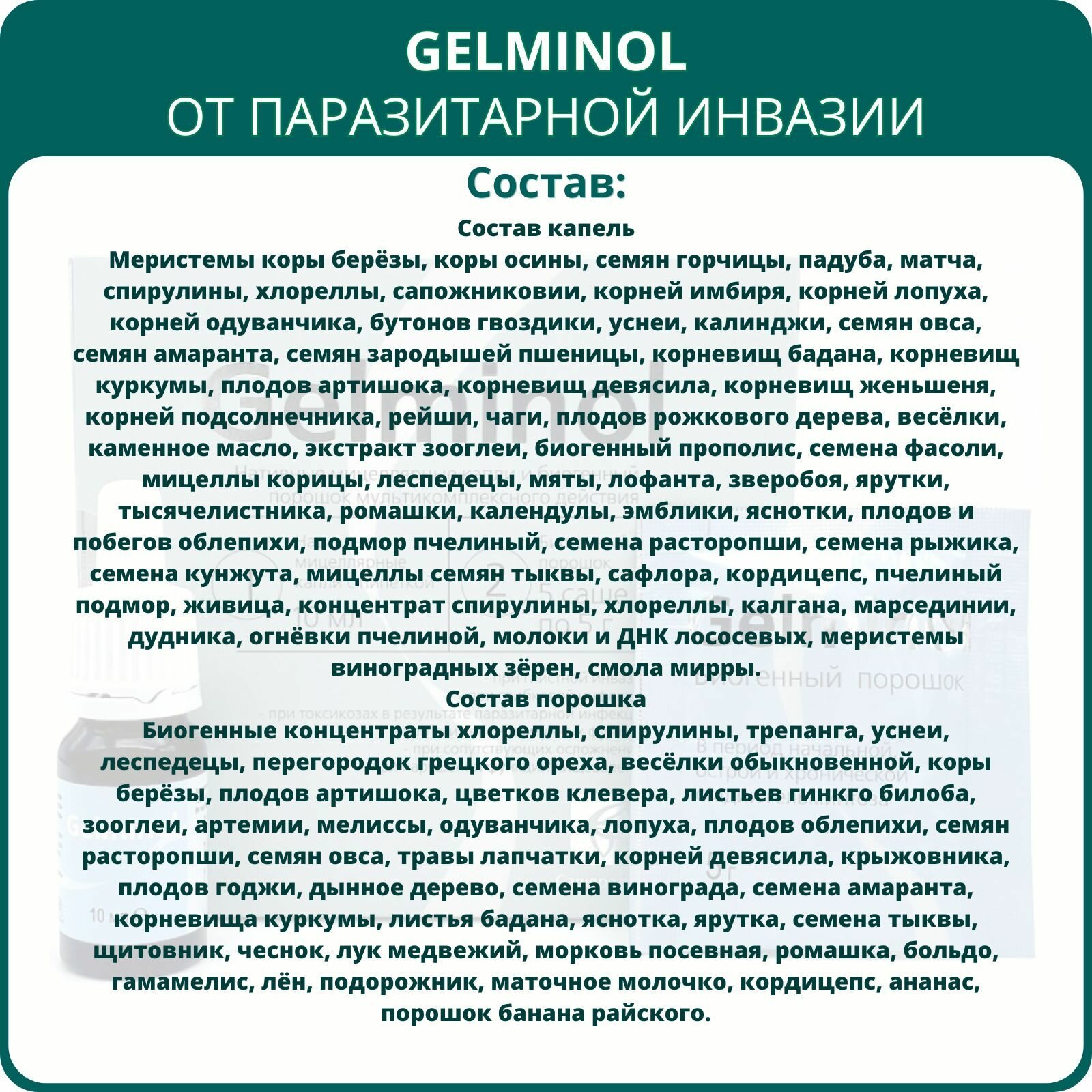 Gelminol от паразитов, капли 10 мл и порошок 5 саше по 5 г — набор 3 шт.: сравнение цен, характеристики, фото, актуальное наличие и цены.