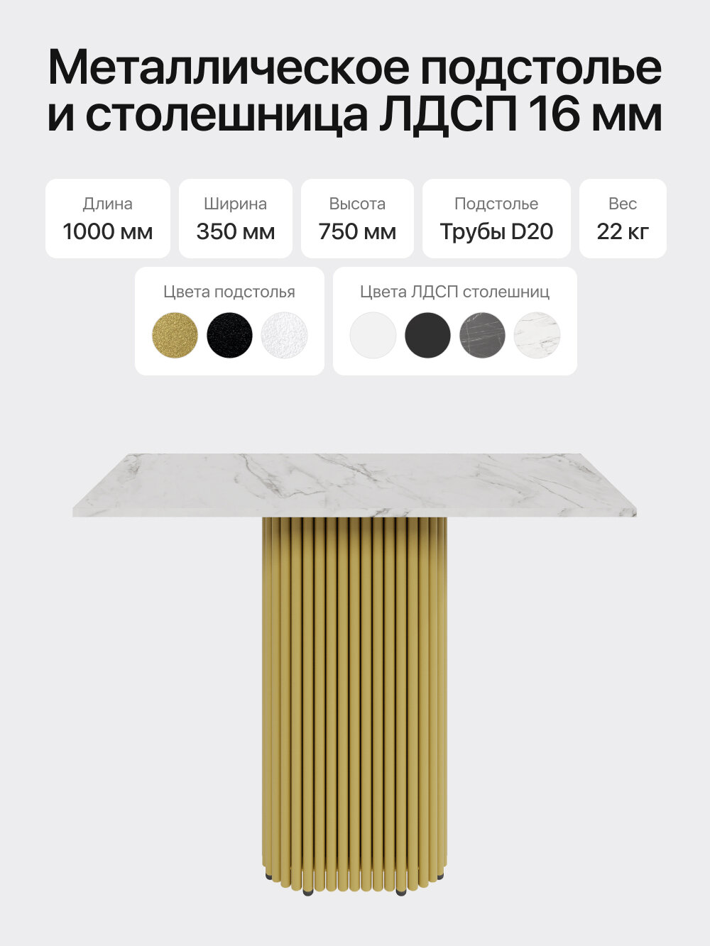 Столешница у столика изготовлена из качественного ламинированного ЛДСП, что позволяет защитить ее от влаги и царапин. Длина и ширина столешницы позволяет удобно и достаточно вместительно разместить вещи или аксессуары.