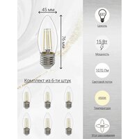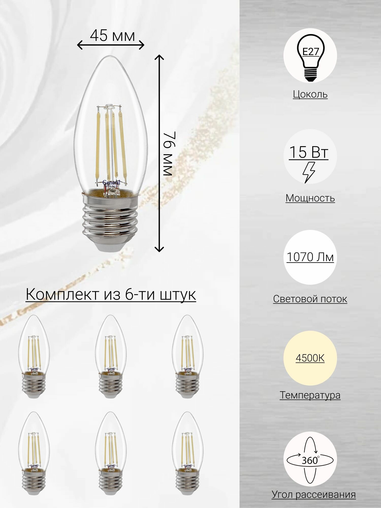 Лампочки филаментные Свеча Филамент прозрачный E27 Наименование GLDEN-CS-15-230-E27-4500 Цоколь E27 Цветовая тем-ра K 4500 Мощность Вт 15 Световой поток лм 1070 Угол рассеивания 360 Размеры мм 35*93 Комплект из 6 шт.