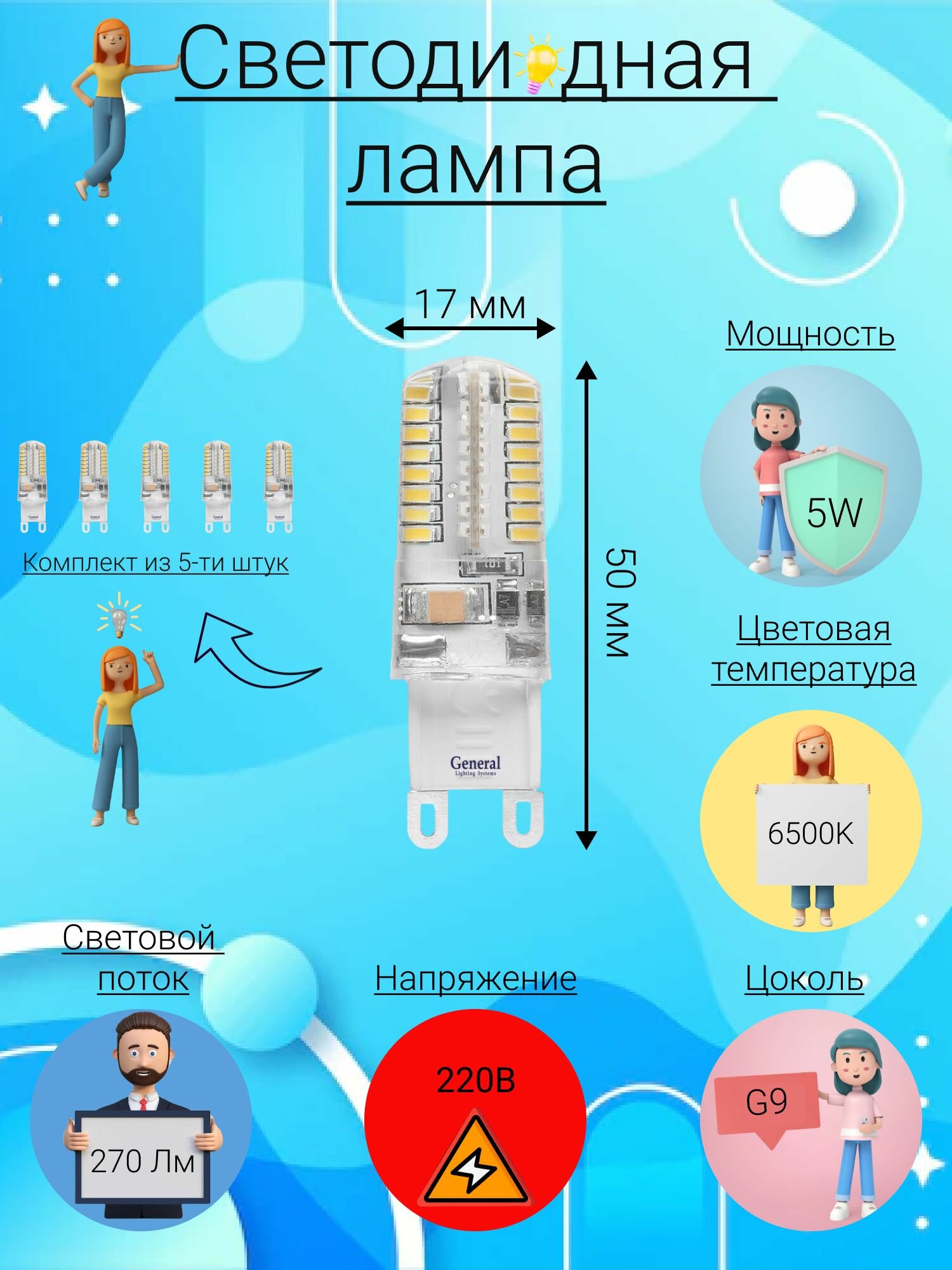 General, Лампа светодиодная, Комплект из 5 шт, 5 Вт, Цоколь G9, 6500К, Форма лампы Кукуруза, G9: сравнение цен, характеристики, фото, актуальное наличие и цены.